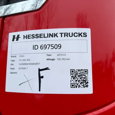 General information Bodywork: Standard tractor Year of construction: 2019 Reference number: 697509 Registration number: 83-BNB-7 Technical information Number of cylinders: 6 Drivetrain Type of fuel: LNG AdBlue system: Yes Axle configuration Brakes: disc brakes Front axle: Max. axle load: 9000 kg; Steering; Tyre profile left: 30%; Tyre profile right: 30% Rear axle: Max. axle load: 11500 kg; Tyre profile left: 30%; Tyre profile right: 30% Measures and weights Empty weight: 8.295 kg GVW: 20.200 kg Wheelbase: 370 cm Maintenance APK (MOT): tested until 11/2026 Condition General condition: very good Technical condition: very good Visual appearance: very good Damages: none Additional information Please contact John Hesselink (+31610500123, john@hesselink-trucks.nl), Witek Kempa (+31651223758, info@hesselink-trucks.nl) or Christel Hesselink (+31 6 21445092, info@hesselink-trucks.nl) for more information Volvo FH460 LNG BJ 03-2019 766.782KM PTO/Hydraulics LNG-System Camera Aansluiting Leren Stoelen Adaptive Cruisecontrol/Lane assist Volvo work remote Afstandsbediening NL Truck APK/TUV 03-11-2026