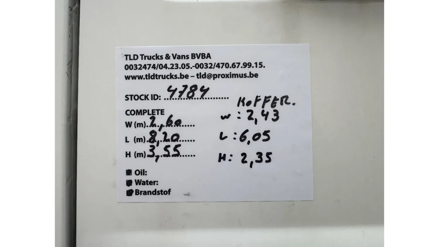 General information Year of construction: 2003 Cab: day Reference number: 4784 Technical information Number of cylinders: 6 Front axle: Steering; Suspension: leaf suspension Rear axle: Double wheels; Suspension: air suspension Empty weight: 6.240 kg GVW: 11.990 kg Functional Dimensions of cargo space: 605 x 243 x 235 cm Tail lift: D'Hollandia, tail lift, 2000 kg Condition General condition: very good Technical condition: very good Visual appearance: very good Additional information Please contact Thierry Leemans (+32474042305, tld@proximus.be) for more information BELGIAN TRUCK