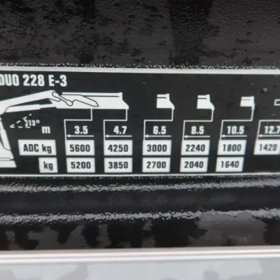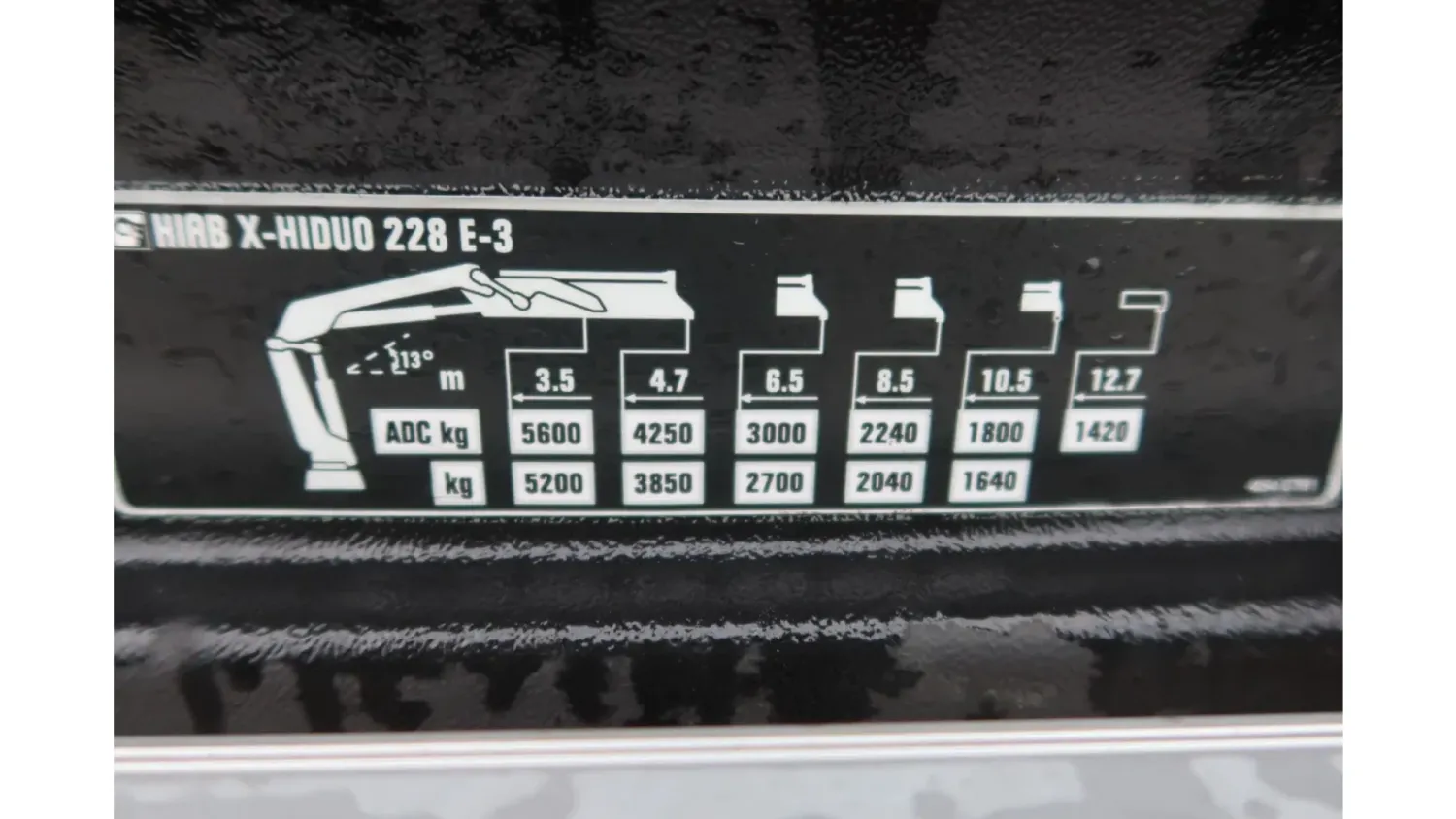 Year of construction: 2019 Front axle 1: Steering Front axle 2: Steering Rear axle 1: Double wheels Rear axle 2: Double wheels; Steering Crane: Hiab 228 E 3, on rear of chassis Reference number: 775870