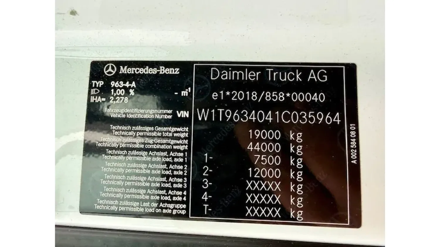 General information Bodywork: Standard tractor Year of construction: 2021 Reference number: 123 Technical information AdBlue system: Yes Front axle: Steering Empty weight: 8.190 kg GVW: 19.000 kg Condition General condition: good Technical condition: good Visual appearance: good Fahrzeugnummer: 123 Mercedes Benz Actros 5 / 1948 Mirror CAM / BigSpace / Retarder / Mega Voll Luft / Eu6d Fgst.Nr.: W1T9634041C035964 Federung: Luft / Luft ( Voll Luft ) Getriebe: Automatik Klima Retarder Motorbremse Tempomat Standheizung Abstandshalte-Assistent Spurhalte-Assistent Navigationssystem Abgasnorm EURO 6d Radstand 3.70 m 2 x Tank 990 L Sonderausstattung: Ablage über Frontscheibe mit Deckel, Anhängersteckdose 15-polig 7+7-polig, Arbeitsscheinwerfer, Ausstattungs-Paket: Economy, Ausstattungs-Paket: Klima, Ausstattungs-Paket: Safety, Außenspiegelkamera MirrorCam, Cockpit Multimedia interaktiv, Druckluftbehälter Aluminium, Drucklufthorn, Elektrische Vorrüstung im Fahrerhaus 24V / 100 A, Getriebe 12-Gang - Typ: G 281-12, Kotflügel 3-teilig, Kraftstofftank: Kombitank Alu - 660 Ltr. Diesel + 75 Ltr. Harnstofflösung (AdBlue), Kraftstofftank: Zusatztank 330 Ltr. Aluminium, rechts, Kühlbox / Kühlschrank, Kühlerjalousie, Lenkhelfpumpe geregelt, Luftleitkörper Dach (rastbar) und seitlich, Montageplatte / Sattelplatte 12 mm für Sattelkupplung, Motorbremse verstärkt, Parametrierbares Sondermodul, Radstandvariante 3700 mm, Rahmenüberhang 1050 mm, Raucher-Paket, Retarder, Rückfahrwarner akustisch (Warnsignal außen), Sattelkupplung: manuell geschmiert, Schlüssel mit Fernbedienung zusätzlich (2), Schnittstelle Flottenmanagement-System, Sitzbezug / Polsterung: Beifahrersitz Velours, Sitzbezug / Polsterung: Fahrersitz Velours, Sitze im Fahrerhaus: Fahrersitz Schwingsitz Komfort, Sitze im Fahrerhaus: Fahrersitzlehne umklappbar, Sonnenblende außen, Sonnenschutzrollo Seitenscheibe, Fahrertür, Staufächer mit Deckel hinter Fahrer- und Beifahrersitz, Stauklappe außen links, Steckdose 12V / 15 A im Beifahrerfussraum zusätzlich, Steckdose 24V im Beifahrerfussraum zusätzlich, Teppichbelag auf Motortunnel, Türverlängerung für Fahrerhaus, Vorhang Schlafkabine, Zusatzheizung (Wasser) Weitere Ausstattung: Abgasnorm EURO 6, Achskonfiguration: 4x2, Achslast Vorderachse 8,0 t, Actros 5, Actros Fahrerhaus S / M, Anfahr-/Frontspiegel beheizt, Anhänger Elektro und Bremsanschluss hoch, Anhängersteckdose 24V / 15-polig, Aufstieg an Fahrerhaus links, Auspuff nach rechts außen, Differentialsperre Hinterachse, Drehmomenterhöhung 12. Gang, Druckluftanschluss im Fahrerhaus, Drucklufteinheit mit Kondenswasserüberwachung, Drucklufteinheit mittel, Einschaltautomatik für Fahrlicht (Lichtsensor), Fahrassistenz-System: Attention-Assist (Müdigkeitserkennungs-Sensor), Fahrassistenz-System: Autonomer Notbrems-Assistent (Active Brake-Assist 5), Fahrassistenz-System: Spurhalteassistent, Fahrerhaus: Fahrerhauseinstieg starr, Fahrerhaus: Kippeinrichtung hydraulisch, Fahrerhaus: S ClassicSpace, 2,30 m, Tunnel 170 mm, Fahrerhaus: stahlgefedert, Standard, Fahrzeug-Umrissleuchten LED, Federung: Luft / Luft (Volluft), Fensterheber elektrisch, Frontscheibe getönt, Fzg. ohne Rückwandfenster, Generator 100 A, Geschwindigkeits-Begrenzeranlage, Hinterachse Tellerrad 440, I