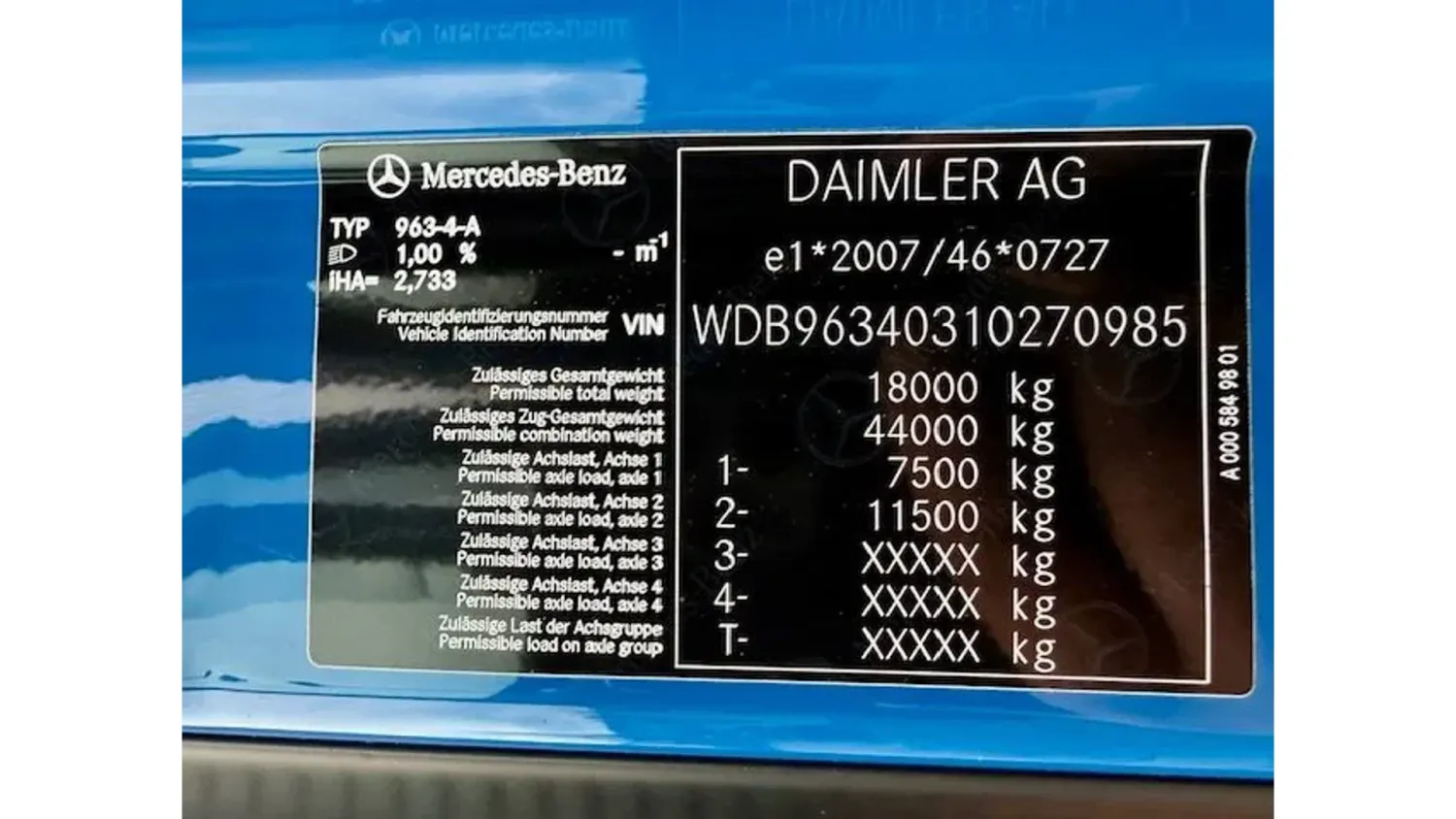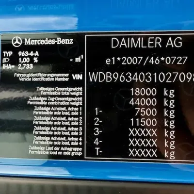 General information Bodywork: Standard tractor Year of construction: 2018 Reference number: 148 Technical information AdBlue system: Yes Front axle: Steering; Suspension: leaf suspension Rear axle: Suspension: air suspension Empty weight: 7.538 kg GVW: 18.000 kg Maintenance APK (MOT): tested until 08/2026 Condition General condition: good Technical condition: good Visual appearance: good Fahrzeugnummer: 148 Mercedes Benz Actros 1846 StreamSpace / Kipphydraulik / Eu6 Fgst.Nr.: WDB96340310270985 Federung: Blatt / Luft Getriebe: Automatik Klima Motorbremse Tempomat Standheizung Abstandshalte-Assistent Spurhalte-Assistent Abgasnorm EURO 6 Kipphydraulik Sonderausstattung: Airbag Fahrerseite, CB-Funk, Drucklufthörner (2) auf Fahrerhausdach, Fahrerhaus: Breite 2,50 m, Federung: Vorderfedern 7,5 t, 2 Blatt, Frontscheibe getönt, Gepäckablage Rückwand oben, Info-Display 12,7 cm mit Zusatzanzeige, Integralheck, Klapptisch in Brüstung, Klimaautomatik, Kühlbox / Kühlschrank, Luftansaugung hinter Fahrerhaus, Montageplatte / Sattelplatte 40 mm für Sattelkupplung, Motorbremse verstärkt, Nebenantrieb MB 131-2c, Rahmenabsenkung ohne Balg-Restdruckregelung, Schnittstelle Flottenmanagement-System, Schubladen unter Brüstung, Sicherungsautomat, Sitze im Fahrerhaus: Fahrersitz Schwingsitz Komfort, Sonnenblende außen, Stahlfelgen 11.75x22.5 (an Vorderachse), Steckdose 12V im Beifahrerfussraum, Steckdose 24V / 25 A im Beifahrerfussraum, Vorbereitung / Schalter Liftachse am Auflieger / Anhänger, Wärmeisolierung zusätzlich, Ölkühler Getriebe Weitere Ausstattung: Abgasnorm EURO 6, Achskonfiguration: 4x2, Achslast Vorderachse 7,5 t, Actros 4, Anhängersteckdose 24V / 15-polig, Arbeitsscheinwerfer, Audiosystem: Radio mit USB-Anschluss, Auspuff nach rechts außen, Außenspiegel elektr. verstell- und heizbar, Differentialsperre Hinterachse, Druckluftbehälter Stahl, Drucklufteinheit mittel, Fahrassistenz-System: Attention-Assist (Müdigkeitserkennungs-Sensor), Fahrassistenz-System: Bremsassistent (Active Brake-Assist), Fahrassistenz-System: Spurhalteassistent, Fahrerhaus: L StreamSpace, Fahrerhaus: stahlgefedert, Komfort, Federung: Blatt / Luft, Federung: Vorderfederbock Aluminium, Fensterheber elektrisch, Generator 100 A, Getriebe 12-Gang - Typ: G 211-12, Harnstofftank (AdBlue): 60 Ltr., Hinterachse Tellerrad 440, Karosserie/Aufbau: Sattelzugmaschine, Komfortliege unten, Komfortschließanlage, Kommunikationsschnittstelle, Kotflügel 3-teilig, Kühlerjalousie, Lenkhelfpumpe geregelt, Luftpresser 2-stufig, Motor 10,7 Ltr. - 335 kW R6 Diesel (OM 470), Motorraum-Kapselung, Rampenspiegel, Restwärmeausnutzung, Scheibenbremsen Vorder- und Hinterachse, Sitzbezug / Polsterung: Stoff, Sitze im Fahrerhaus: Beifahrerfunktionssitz, Sitze im Fahrerhaus: Fahrersitzlehne umklappbar, Spannungswandler 24V / 12V 10 A, Spritzschutz vorn, Stabilisator Vorderachse, Stauklappe außen links, Steckdose Fahrerhaus 24V, Tachograph / EG-Kontrollgerät, Türverlängerung für Fahrerhaus, Unterbodenverkleidung aerodynamisch geformt, Unterfahrschutz vorn, Vorbereitung Mauterfassung, Vorderachse gekröpft, Wasserpumpe geregelt, Zul. Gesamtgewicht 18,00 t, Zusatzheizung (Wasser)