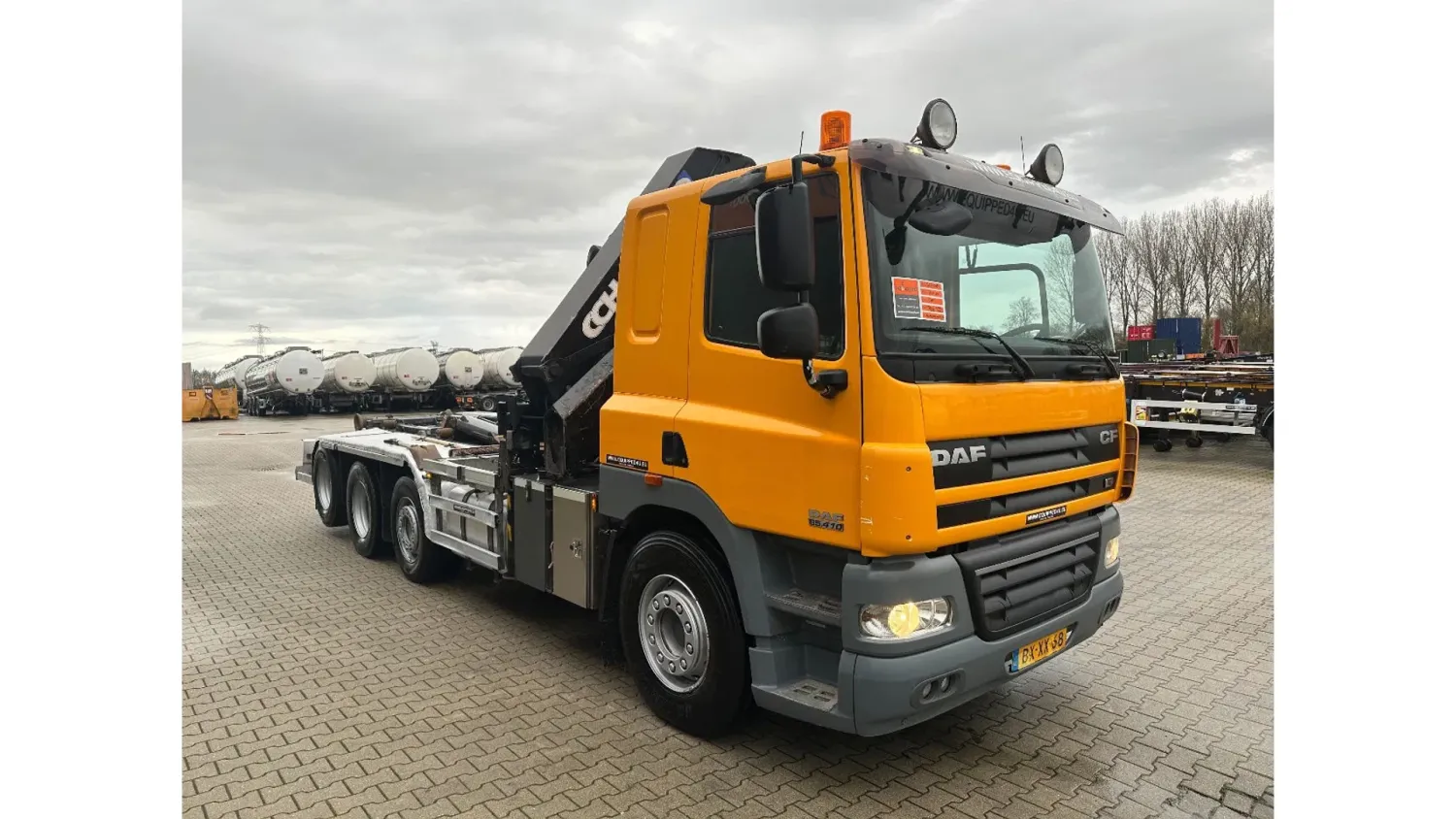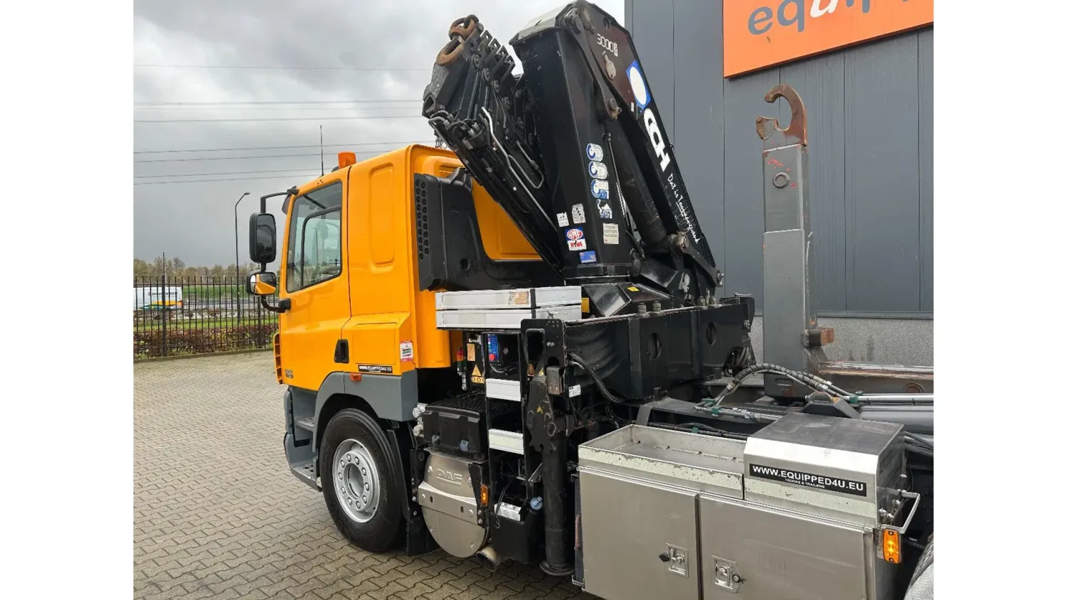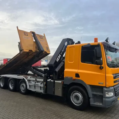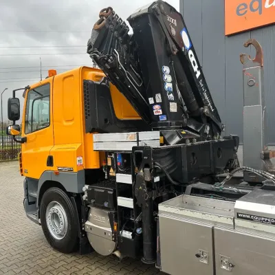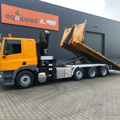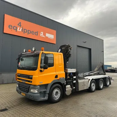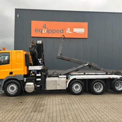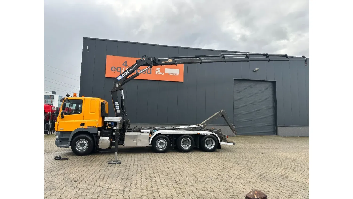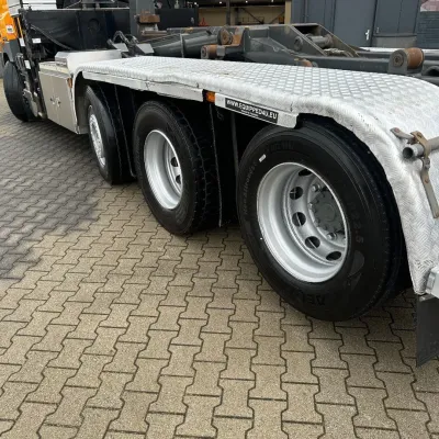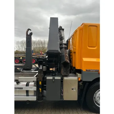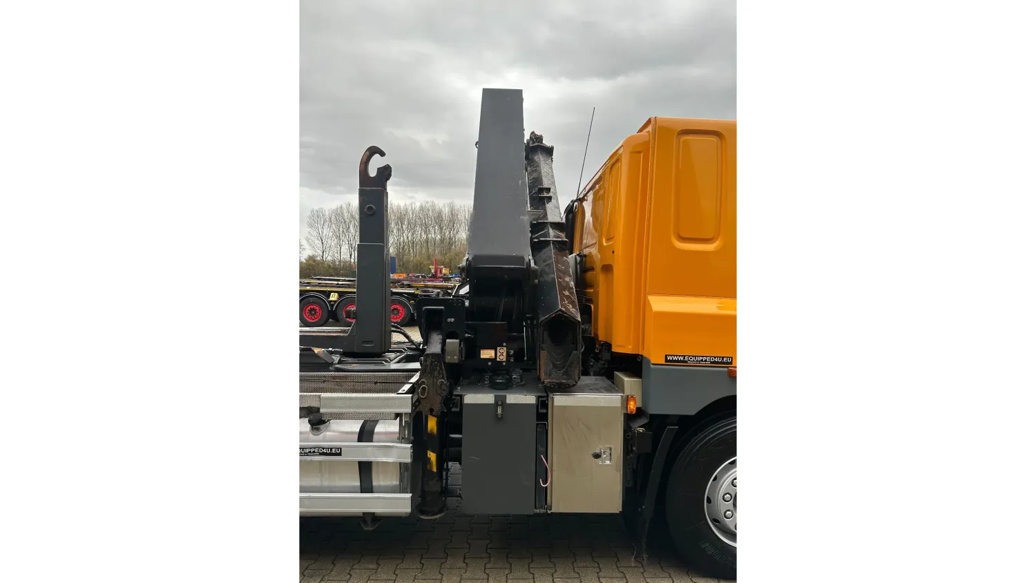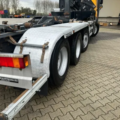 General information Bodywork: Hook arm system Year of construction: 2011 Reference number: BXXX68.PF Registration number: BX-XX-68 Technical information Number of cylinders: 6 Drivetrain AdBlue system: Yes Axle configuration Brakes: disc brakes Front axle: Tyre size: 385/65-R22.5; Max. axle load: 9000 kg; Steering; Tyre profile left: 30%; Tyre profile right: 50% Rear axle 1: Tyre size: 385/55-R22.5; Lift axle; Max. axle load: 7500 kg; Steering; Tyre profile left: 30%; Tyre profile right: 60% Rear axle 2: Tyre size: 315/70-R22.5; Double wheels; Max. axle load: 11500 kg; Tyre profile left inner: 25%; Tyre profile left outer: 30%; Tyre profile right outer: 50%; Tyre profile right outer: 40% Rear axle 3: Tyre size: 315/70-R22.5; Double wheels; Lift axle; Max. axle load: 7500 kg; Tyre profile left inner: 40%; Tyre profile left outer: 45%; Tyre profile right outer: 60%; Tyre profile right outer: 60% Measures and weights Empty weight: 17.830 kg GVW: 35.500 kg Wheelbase: 670 cm Functional Lifting capacity: 30.000 kg Lift height: 2.000 cm Crane: HMF 3000 K6, year of manufacture 2010, behind the cab Make of bodywork: DAF CE mark: yes Condition General condition: very good Technical condition: very good Visual appearance: very good Additional information Please contact Arne Honingh (+31654262504, sales@equipped4u.eu) for more information 2011 DAF CF85.410 with HMF 3000 K6 crane (6x extendable) + radio remote control (incl. charger / spare battery), HYVALIFT 26 ton hook + flat roll-off container with sideboards and stake pots, 798,895 km, automatic gearbox, air conditioning, 1x bed, radio / CD, Dutch registration with valid technical inspection (APK) until 12-01-2026.