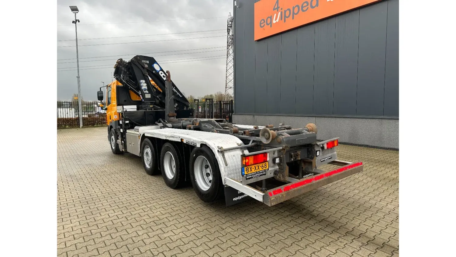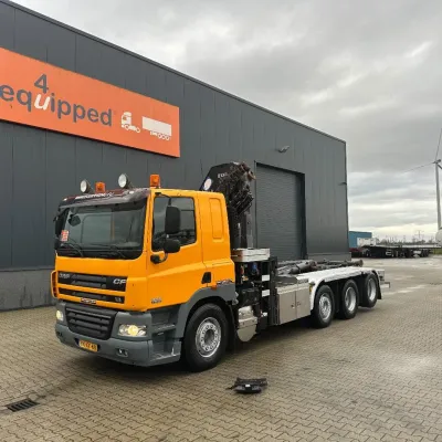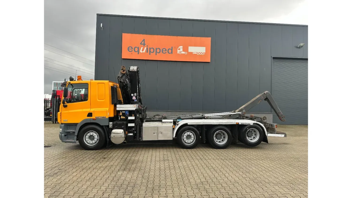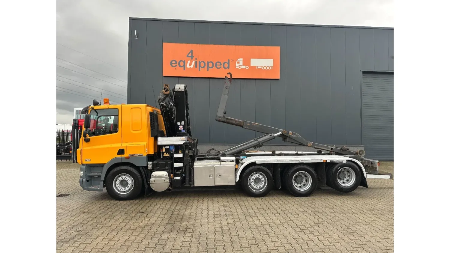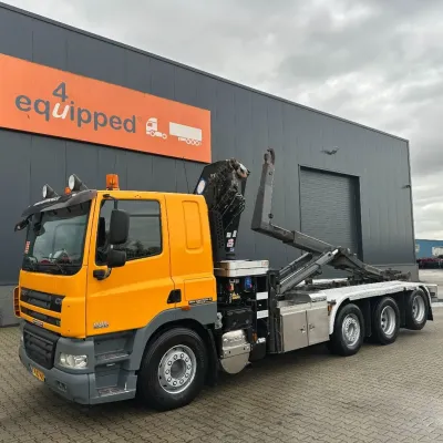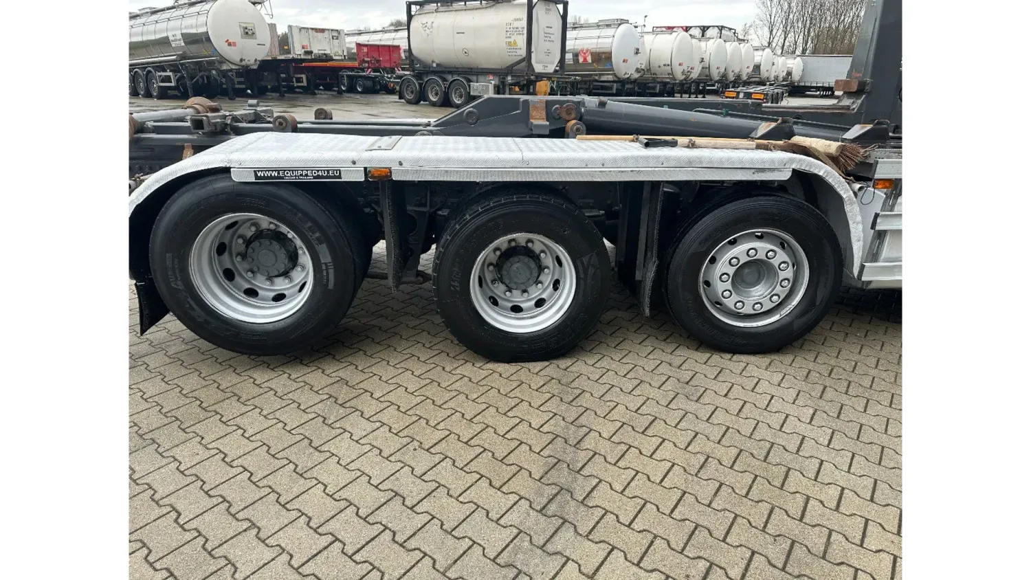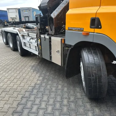 General information Bodywork: Hook arm system Year of construction: 2011 Reference number: BXXX68.PF Registration number: BX-XX-68 Technical information Number of cylinders: 6 Drivetrain AdBlue system: Yes Axle configuration Brakes: disc brakes Front axle: Tyre size: 385/65-R22.5; Max. axle load: 9000 kg; Steering; Tyre profile left: 30%; Tyre profile right: 50% Rear axle 1: Tyre size: 385/55-R22.5; Lift axle; Max. axle load: 7500 kg; Steering; Tyre profile left: 30%; Tyre profile right: 60% Rear axle 2: Tyre size: 315/70-R22.5; Double wheels; Max. axle load: 11500 kg; Tyre profile left inner: 25%; Tyre profile left outer: 30%; Tyre profile right outer: 50%; Tyre profile right outer: 40% Rear axle 3: Tyre size: 315/70-R22.5; Double wheels; Lift axle; Max. axle load: 7500 kg; Tyre profile left inner: 40%; Tyre profile left outer: 45%; Tyre profile right outer: 60%; Tyre profile right outer: 60% Measures and weights Empty weight: 17.830 kg GVW: 35.500 kg Wheelbase: 670 cm Functional Lifting capacity: 30.000 kg Lift height: 2.000 cm Crane: HMF 3000 K6, year of manufacture 2010, behind the cab Make of bodywork: DAF CE mark: yes Condition General condition: very good Technical condition: very good Visual appearance: very good Additional information Please contact Arne Honingh (+31654262504, sales@equipped4u.eu) for more information 2011 DAF CF85.410 with HMF 3000 K6 crane (6x extendable) + radio remote control (incl. charger / spare battery), HYVALIFT 26 ton hook + flat roll-off container with sideboards and stake pots, 798,895 km, automatic gearbox, air conditioning, 1x bed, radio / CD, Dutch registration with valid technical inspection (APK) until 12-01-2026.
