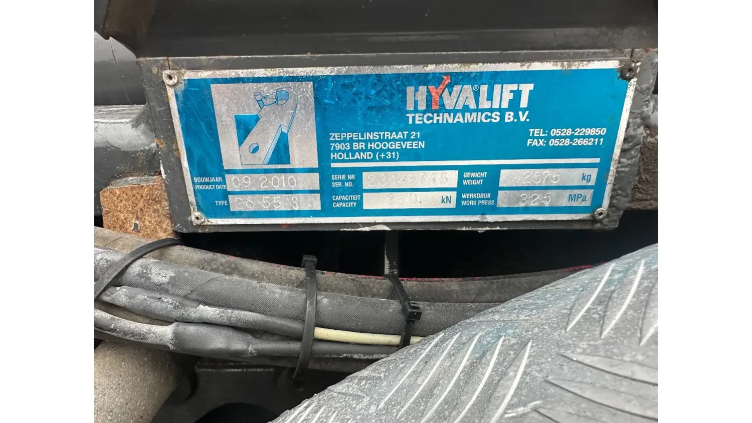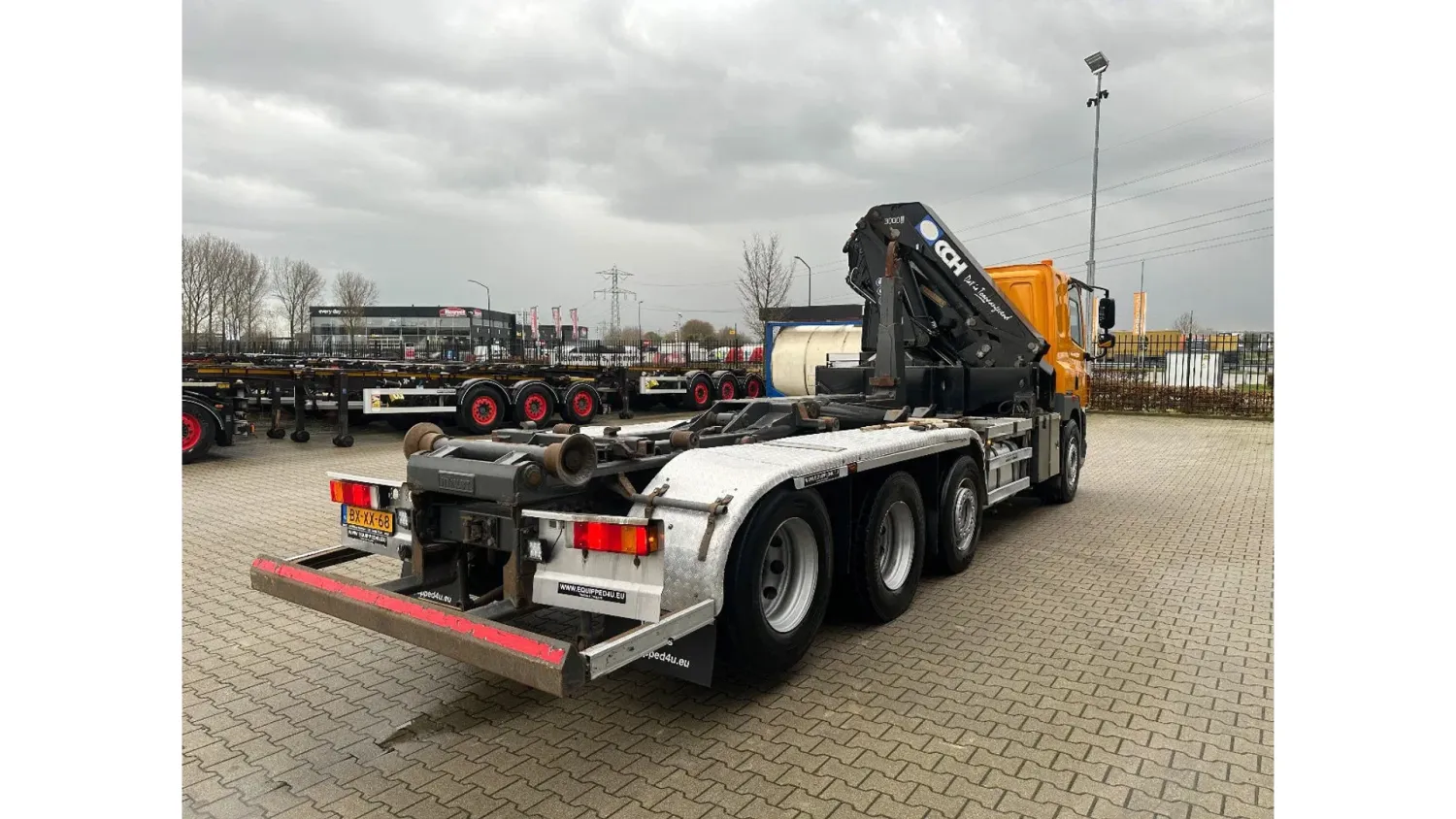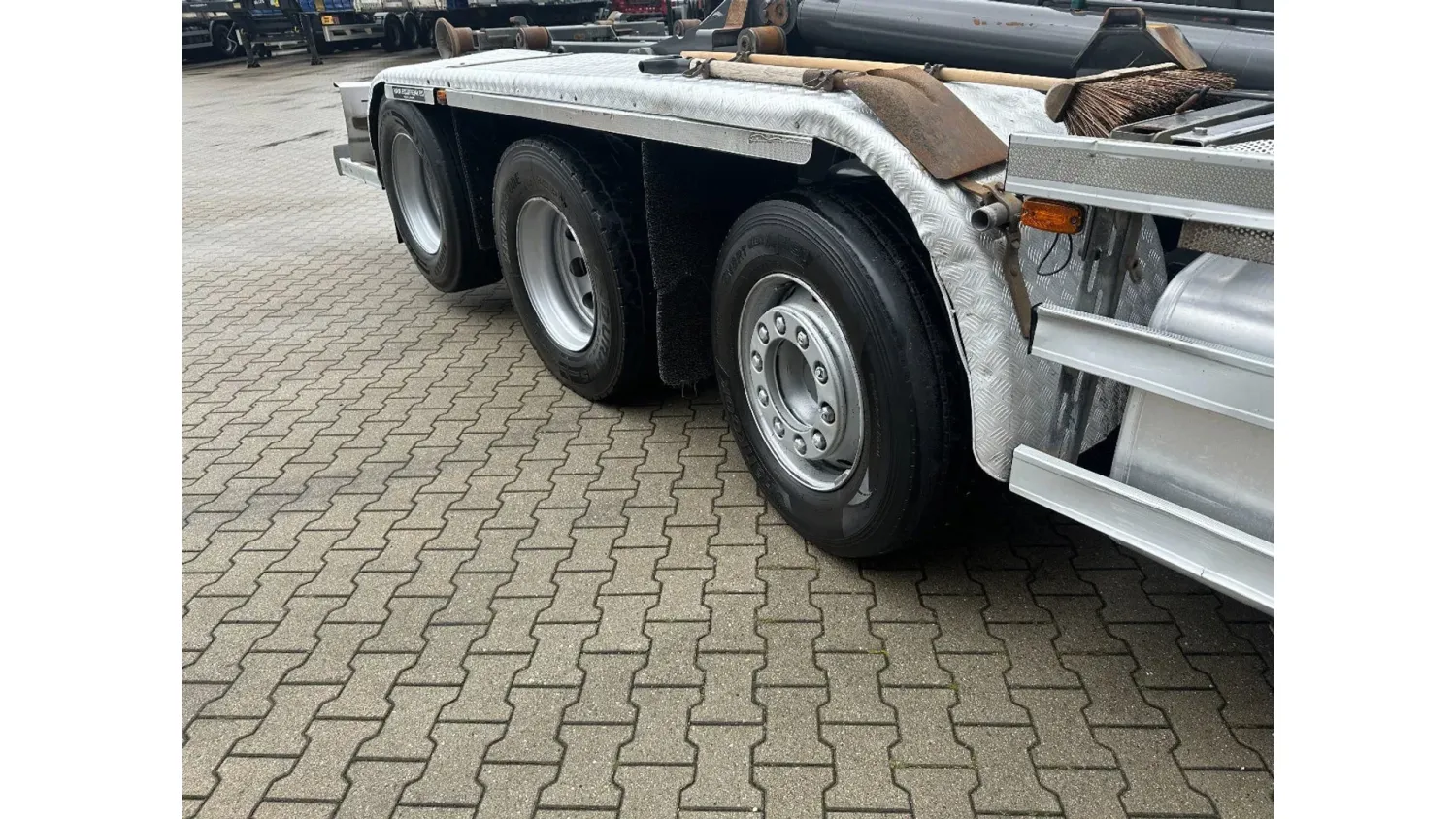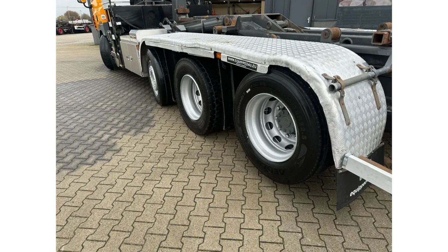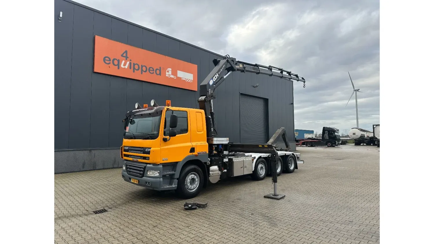 General information Bodywork: Hook arm system Year of construction: 2011 Reference number: BXXX68.PF Registration number: BX-XX-68 Technical information Number of cylinders: 6 Drivetrain AdBlue system: Yes Axle configuration Brakes: disc brakes Front axle: Tyre size: 385/65-R22.5; Max. axle load: 9000 kg; Steering; Tyre profile left: 30%; Tyre profile right: 50% Rear axle 1: Tyre size: 385/55-R22.5; Lift axle; Max. axle load: 7500 kg; Steering; Tyre profile left: 30%; Tyre profile right: 60% Rear axle 2: Tyre size: 315/70-R22.5; Double wheels; Max. axle load: 11500 kg; Tyre profile left inner: 25%; Tyre profile left outer: 30%; Tyre profile right outer: 50%; Tyre profile right outer: 40% Rear axle 3: Tyre size: 315/70-R22.5; Double wheels; Lift axle; Max. axle load: 7500 kg; Tyre profile left inner: 40%; Tyre profile left outer: 45%; Tyre profile right outer: 60%; Tyre profile right outer: 60% Measures and weights Empty weight: 17.830 kg GVW: 35.500 kg Wheelbase: 670 cm Functional Lifting capacity: 30.000 kg Lift height: 2.000 cm Crane: HMF 3000 K6, year of manufacture 2010, behind the cab Make of bodywork: DAF CE mark: yes Condition General condition: very good Technical condition: very good Visual appearance: very good Additional information Please contact Arne Honingh (+31654262504, sales@equipped4u.eu) for more information 2011 DAF CF85.410 with HMF 3000 K6 crane (6x extendable) + radio remote control (incl. charger / spare battery), HYVALIFT 26 ton hook + flat roll-off container with sideboards and stake pots, 798,895 km, automatic gearbox, air conditioning, 1x bed, radio / CD, Dutch registration with valid technical inspection (APK) until 12-01-2026.