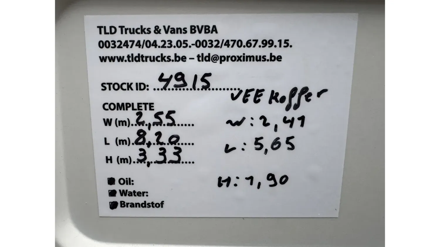 General information Year of construction: 1990 Cab: day Reference number: 4915 Axle configuration Suspension: leaf suspension Front axle: Steering Rear axle: Double wheels Weights Empty weight: 6.670 kg GVW: 11.000 kg Functional Dimensions of cargo space: 565 x 241 x 190 cm Tail lift: tail lift Condition General condition: very good Technical condition: very good Visual appearance: very good Financial information Price: On request Additional information Please contact Thierry Leemans (+32474042305, tld@proximus.be) for more information BELGIAN TRUCK VERRY VERRY CLEAN