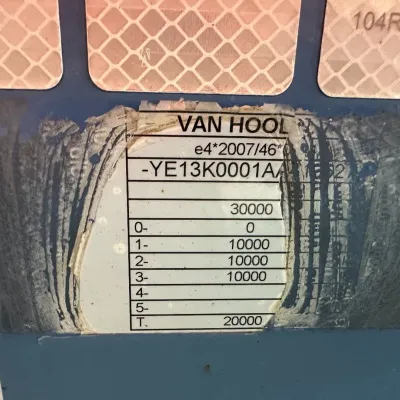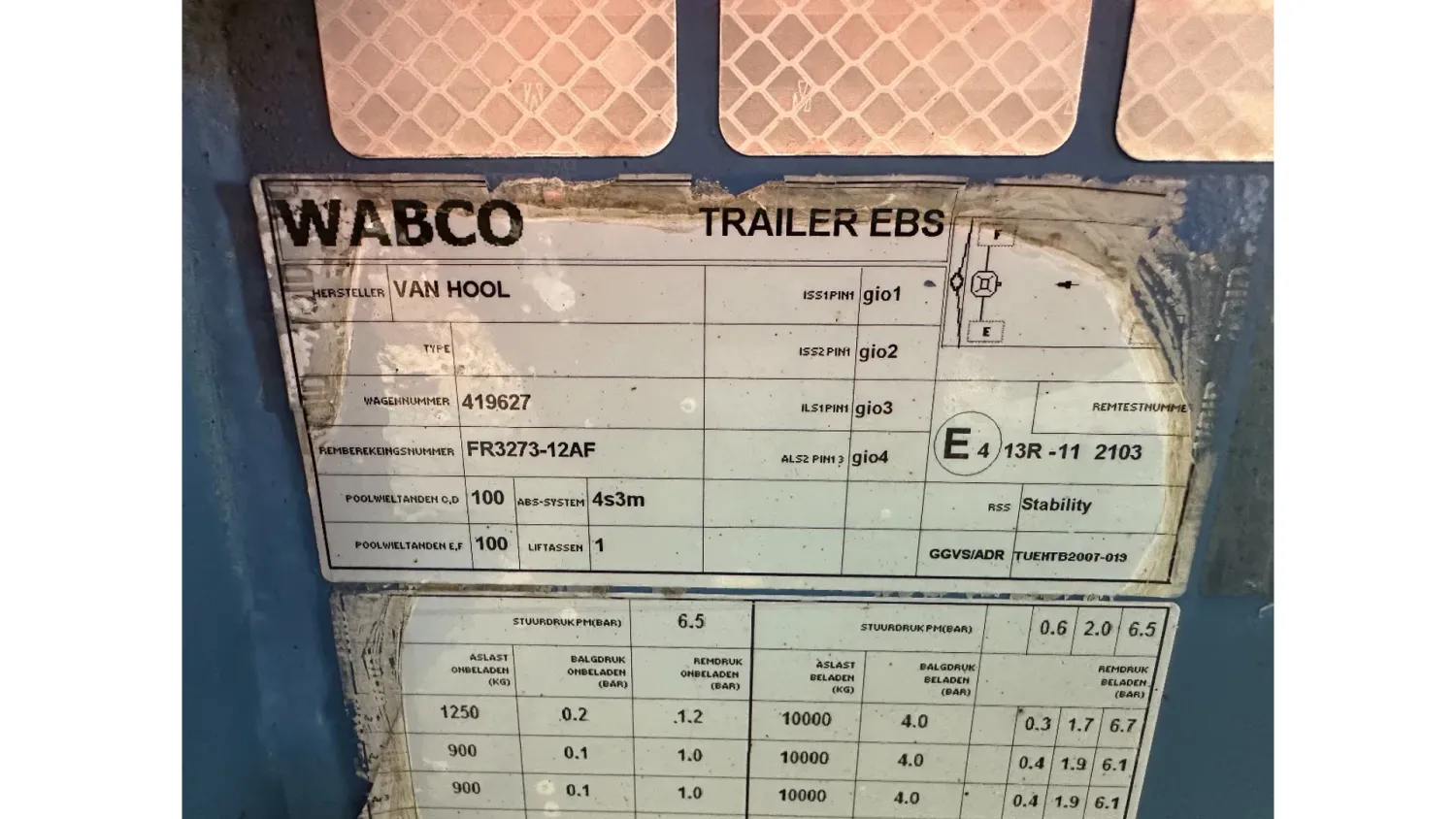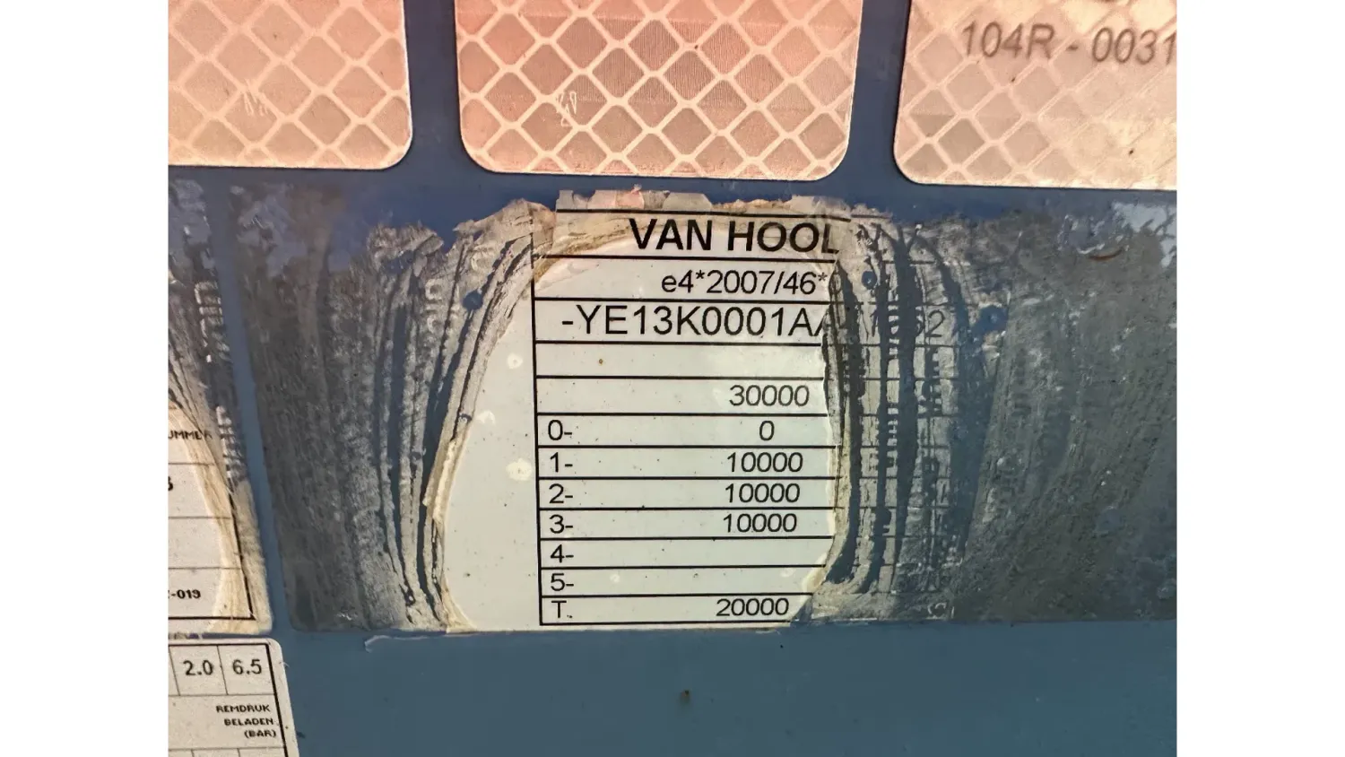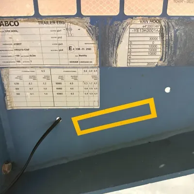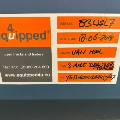 General information Year of construction: 2014 Reference number: 83WSL7 Registration number: 83-WSL-7 Axle configuration Tyre size: 275/70-R22.5 Make axles: BPW Eco-Plus Brakes: disc brakes Suspension: air suspension Front axle: Double wheels; Alloy wheels; Max. axle load: 10000 kg; Steering; Tyre profile left inner: 70%; Tyre profile left outer: 45%; Tyre profile right outer: 55%; Tyre profile right outer: 50% Rear axle 1: Double wheels; Alloy wheels; Lift axle; Max. axle load: 9000 kg; Tyre profile left inner: 20%; Tyre profile left outer: 20%; Tyre profile right outer: 25%; Tyre profile right outer: 20% Rear axle 2: Double wheels; Alloy wheels; Max. axle load: 9000 kg; Tyre profile left inner: 50%; Tyre profile left outer: 50%; Tyre profile right outer: 55%; Tyre profile right outer: 50% Measures and weights Empty weight: 4.260 kg GVW: 30.000 kg Wheelbase: 546 cm Functional Make of bodywork: VAN HOOL B3C001 Condition General condition: very good Technical condition: very good Visual appearance: very good Additional information Please contact Arne Honingh (+31654262504, sales@equipped4u.eu) for more information very nice 2014 VAN HOOL 3-axle trailer with ABS/EBS, BPW Eco-Plus axles with disc brakes, air suspension, 2x lift/lower, connection for 1x 20FT container, 2nd axle = lift axle, ALCOA rims, unladen weight: 4,260kg, max weight: 30,000kg, dual tires with 275/70-R22.5 tires (left profile: 7/11, 3/3, 8/8mm; right profile: 8/9, 3/4, 8/9mm), Dutch registration