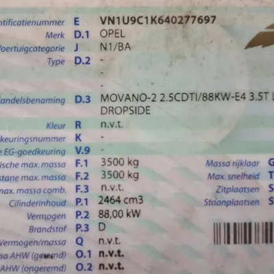 General information Type of body: Car transporter Year of construction: 2008 Reference number: OPel Movano Autotransporter Registration number: 67-VVZ-3 Technical information Number of cylinders: 4 Type of fuel: Diesel Fuel tank: 80 litres Max. front axle load: 1850 kg Max. rear axle load: 2060 kg Measures and weights Empty weight: 1.930 kg GVW: 3.500 kg Wheelbase: 408 cm Functional Dimensions of cargo space: 408 x 198 cm Make of bodywork: Opel Maintenance, history and condition APK (MOT): tested until 11/2026 General condition: good Technical condition: good Financial information VAT/margin: VAT qualifying Additional information Please contact Vitali Lenda (+31 6 20260621, verkoop@toonnetten.nl) for more information