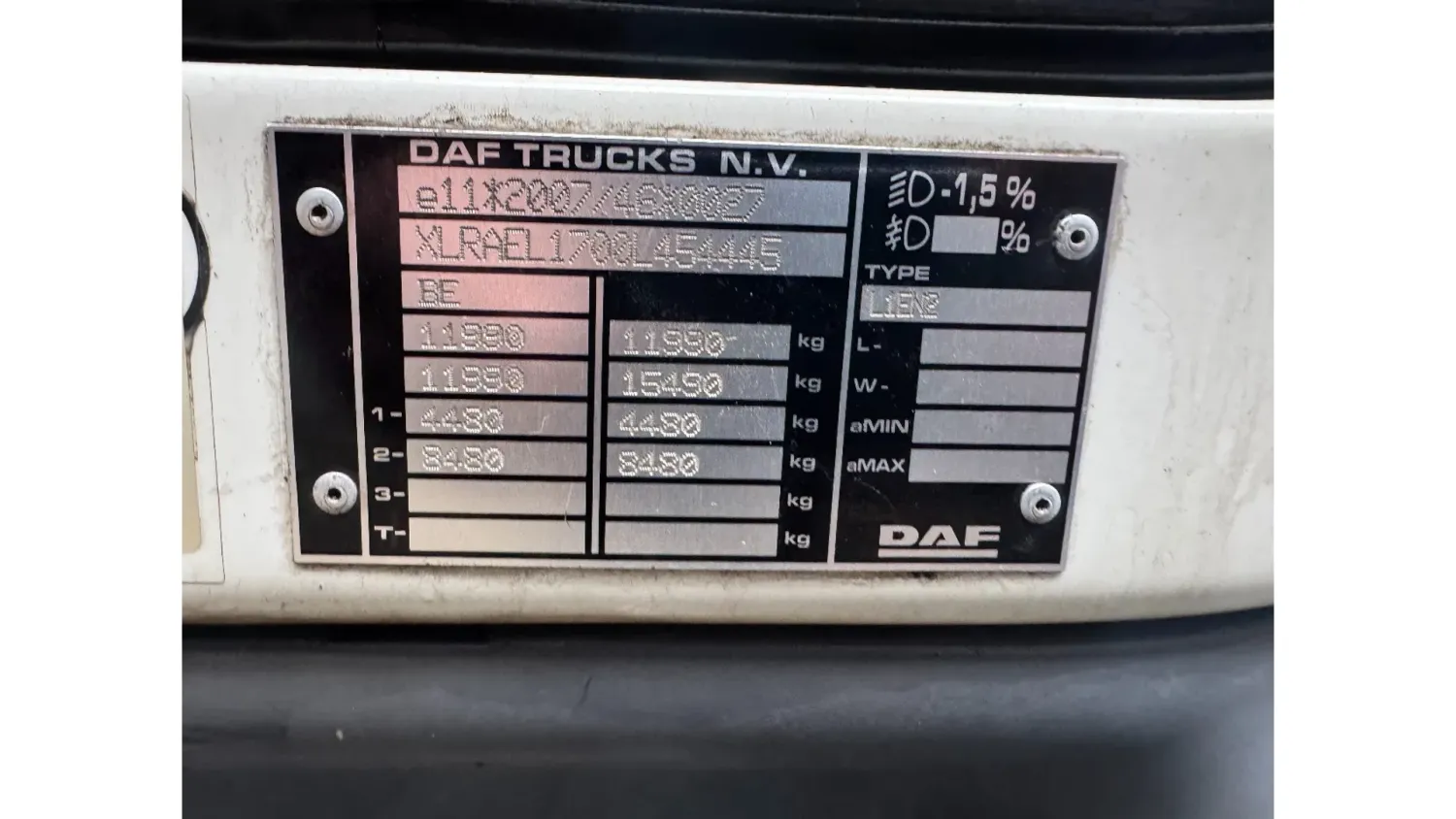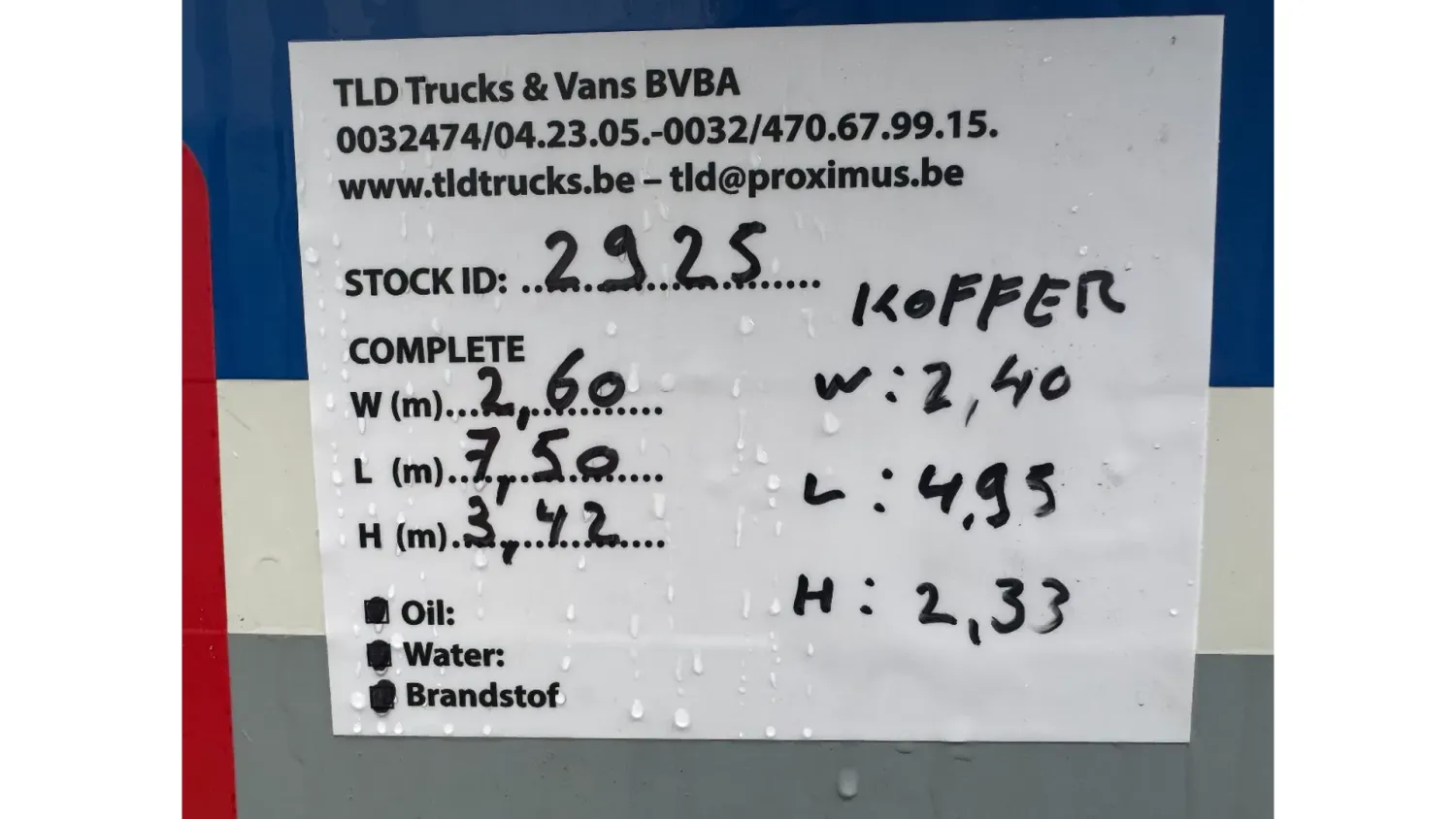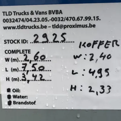 General information Year of construction: 2016 Reference number: 4925 Technical information AdBlue system: Yes Front axle: Steering; Suspension: leaf suspension Rear axle: Double wheels; Suspension: air suspension Empty weight: 6.077 kg GVW: 11.990 kg Functional Dimensions of cargo space: 495 x 240 x 233 cm Tail lift: tail lift, 1500 kg Maintenance APK (MOT): tested until 06/2026 Condition General condition: very good Technical condition: very good Visual appearance: very good Additional information Please contact Thierry Leemans (+32474042305, tld@proximus.be) for more information BELGIAN TRUCK