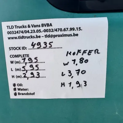 General information Type of body: Delivery van Year of construction: 2001 Cab: day Reference number: 4935 Drivetrain Type of fuel: Diesel Axle configuration Suspension: leaf suspension Front axle: Steering Rear axle: Double wheels Weights Empty weight: 2.850 kg GVW: 3.500 kg Condition General condition: very good Technical condition: very good Visual appearance: very good Financial information VAT/margin: VAT not deductable (margin scheme) Additional information Please contact Thierry Leemans (+32474042305, tld@proximus.be) for more information BELGIAN ORIGINE
