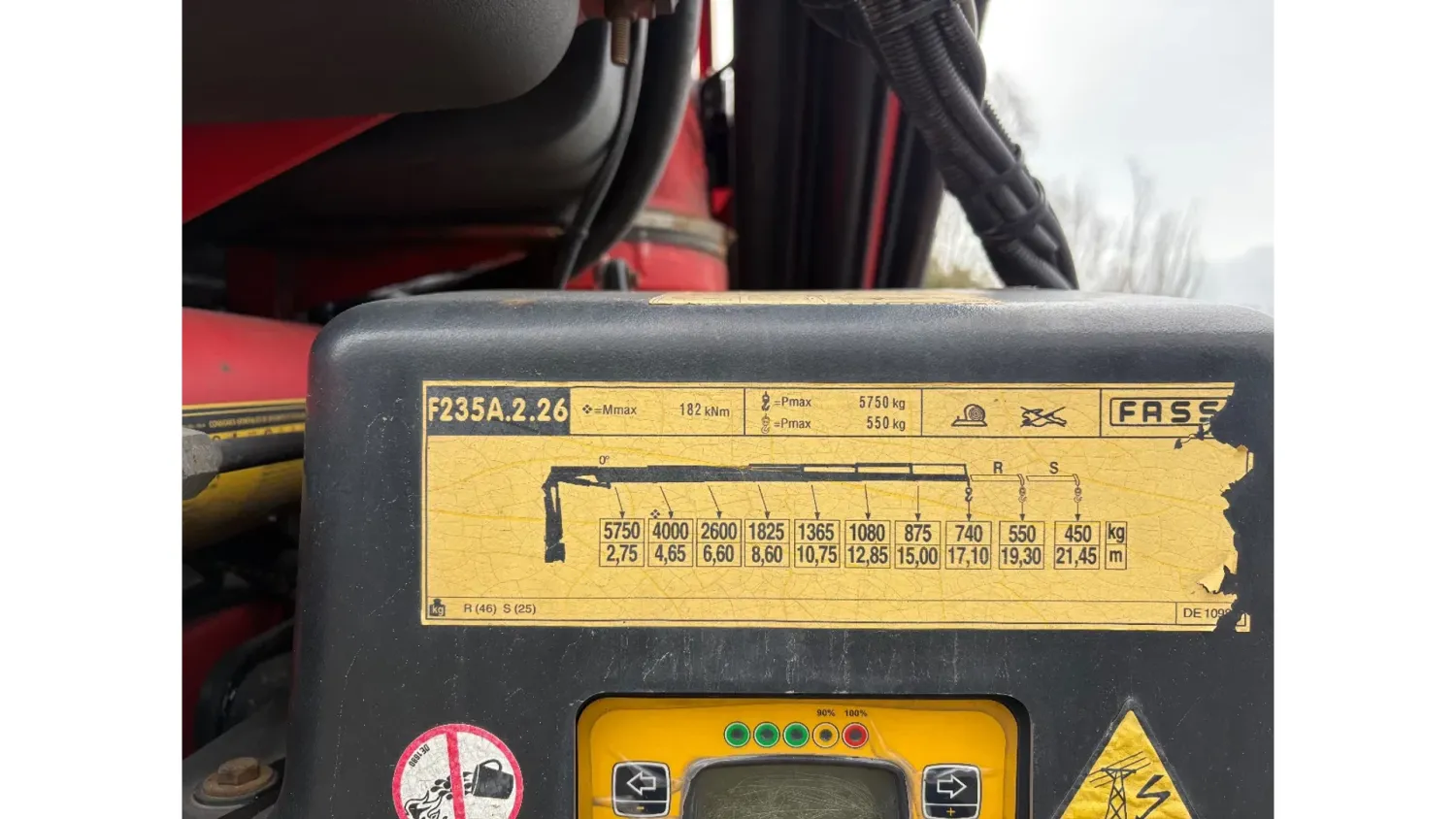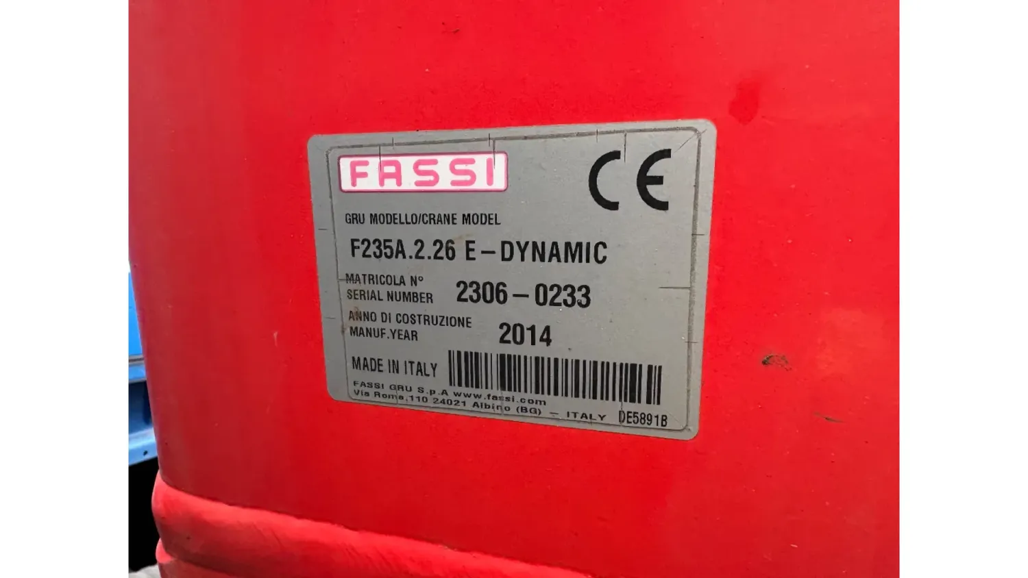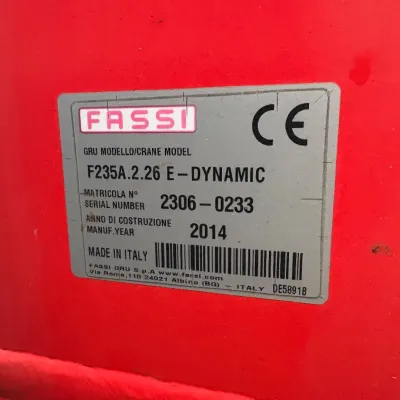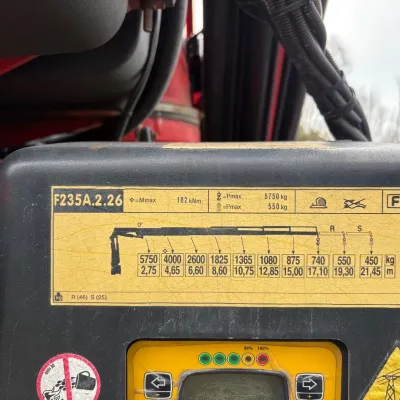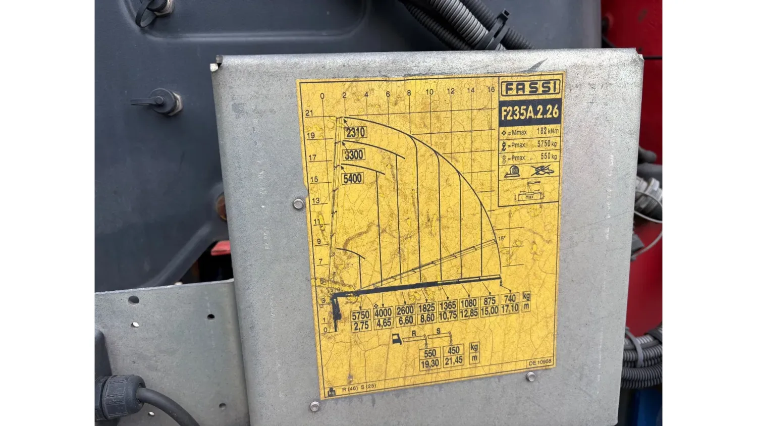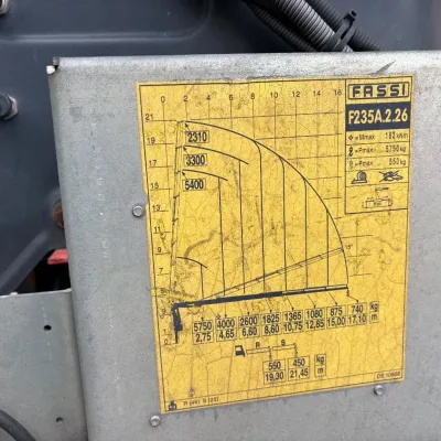 General information Year of construction: 2014 Registration number: 27-BXG-7 Axle configuration Brakes: disc brakes Front axle: Max. axle load: 8500 kg; Steering; Tyre profile left: 40%; Tyre profile right: 40% Rear axle: Double wheels; Max. axle load: 11500 kg; Tyre profile left inner: 35%; Tyre profile left outer: 35%; Tyre profile right outer: 35%; Tyre profile right outer: 35% Weights Empty weight: 11.300 kg GVW: 21.000 kg Functional Crane: Yes Make of bodywork: FASSI F235A.2.26 E - DYNAMIC Condition General condition: good Technical condition: good Visual appearance: good Additional information Please contact Marnix kaan (+31653817873, mk@matrux.nl) for more information
