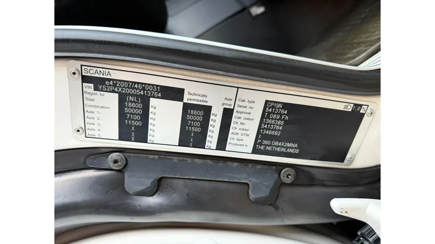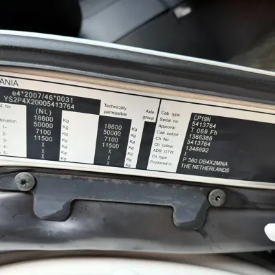 General information Year of construction: 2016 Reference number: 036174 Registration number: 21-BHF-3 Technical information Number of cylinders: 5 Drivetrain AdBlue system: Yes Axle configuration Brakes: disc brakes Front axle: Max. axle load: 7100 kg; Steering; Tyre profile left: 30%; Tyre profile right: 30% Rear axle: Differential lock; Max. axle load: 11500 kg; Tyre profile left: 40%; Tyre profile right: 40% Measures and weights Empty weight: 10.975 kg GVW: 18.600 kg Wheelbase: 630 cm Functional Dimensions of cargo space: 820 x 248 x 275 cm Tail lift: Dhollandia DHLV, tail lift, 2000 kg Maintenance APK (MOT): tested until 04/2026 Condition General condition: very good Technical condition: very good Visual appearance: very good Damages: none Other information Cargo space outer length: 820 cm Cargo space outer width: 248 cm Cargo space outer height: 275 cm Additional information Please contact John Hesselink (+31610500123, john@hesselink-trucks.nl), Witek Kempa (+31651223758, info@hesselink-trucks.nl) or Christel Hesselink (+31 6 21445092, info@hesselink-trucks.nl) for more information Scania P360 BJ 04-2016 734.223KM EURO 6 Dhollandia Laadklep 2.000KG Cruise Control Airco Radio NL Truck APK/TUV 28-04-2026