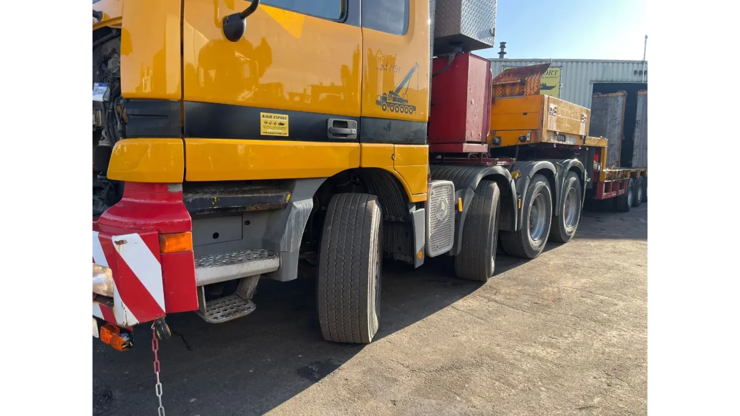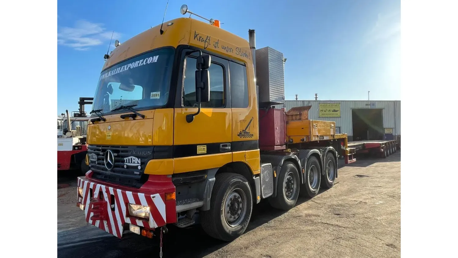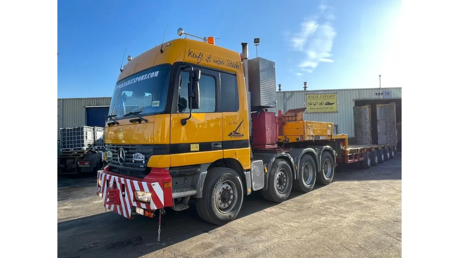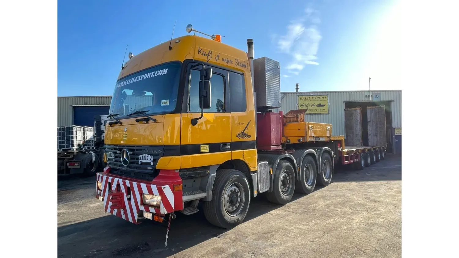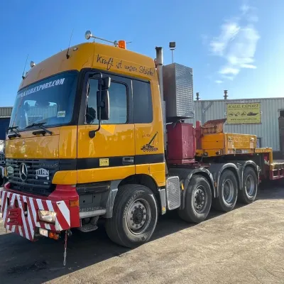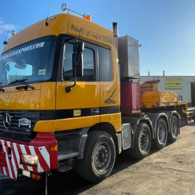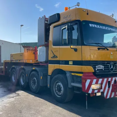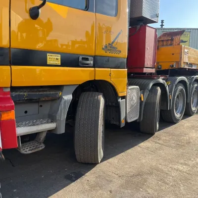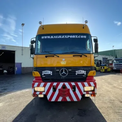 General information Bodywork: Standard tractor Year of construction: 1999 Reference number: 2591 Technical information Number of cylinders: 8 Transmission Transmission: ZF, Manual gearbox Axle configuration Suspension: leaf suspension Front axle: Max. axle load: 7500 kg; Steering Rear axle 1: Max. axle load: 6000 kg; Steering Rear axle 2: Double wheels; Max. axle load: 9000 kg; Reduction: hub reduction Rear axle 3: Double wheels; Max. axle load: 9000 kg; Reduction: hub reduction Condition General condition: good Technical condition: good Visual appearance: good Financial information VAT/margin: VAT not deductable (margin scheme) Additional information Please contact Sales Department (+31682062695, sales@kalilexport.com) for more information Mercedes-Benz 4153 Actros Titan Heavy Duty Tractor V8 Engine 530HP 8x4 Full Steel Suspension 12 Tyre's !!!ONLY 195.000KM!!! Big Axle's German Truck +++ Goldhofer STZ-L5-54 Lowbed 5 Axle 4 Steering Axle's 20 Tyre's 70.000KG Loading Ramps German Registration Extendable We can ship this truck to all destinations FOR MORE INFO: WWW.KALILEXPORT.COM Sales Department : 00 31 6 82 06 26 95