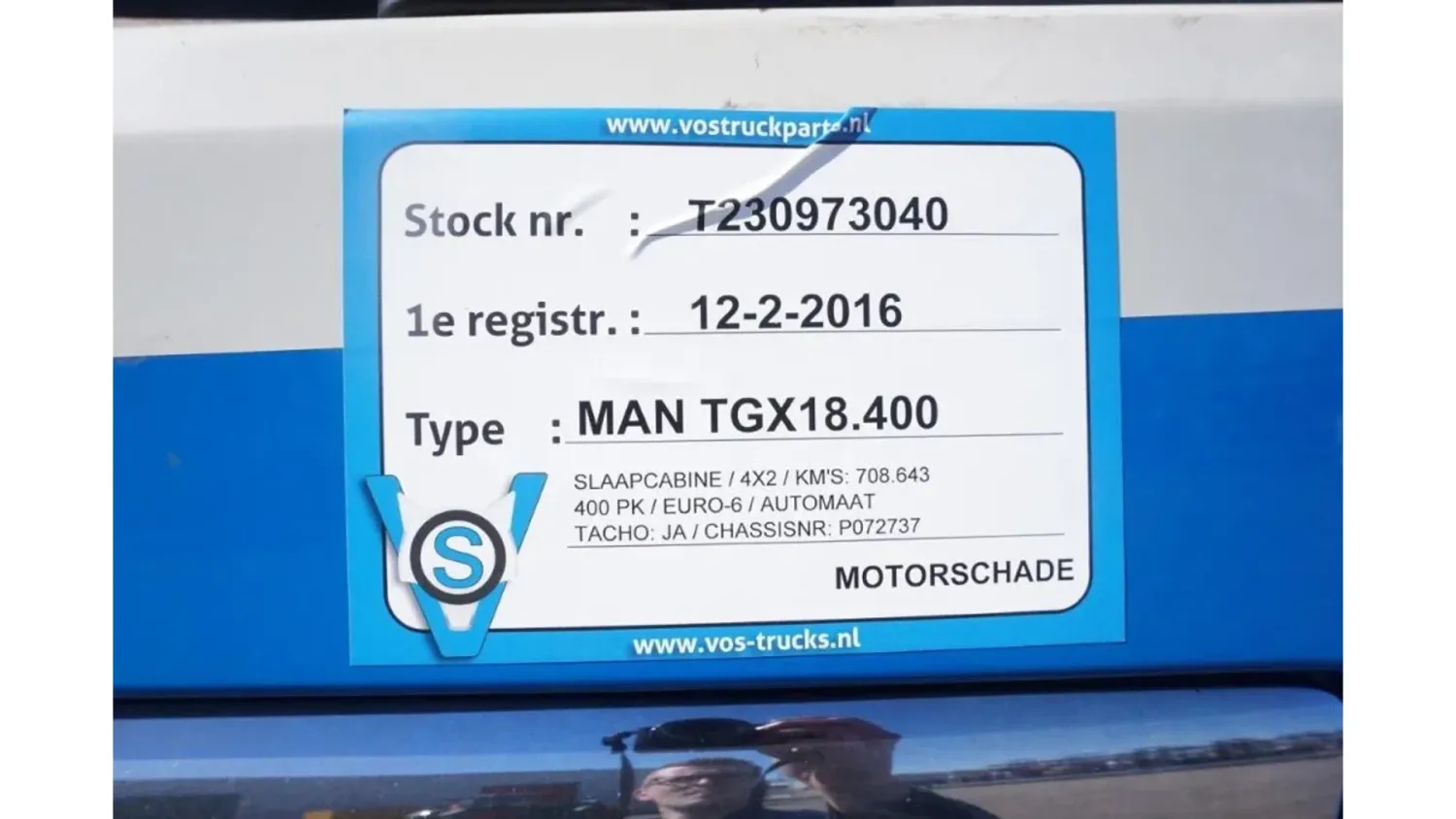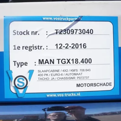 General information Bodywork: Standard tractor Year of construction: 2016 Reference number: T230973040 Serial number: WMA06XZZ6GP072737 Drivetrain AdBlue system: Yes Axle configuration Brakes: disc brakes Front axle: Tyre size: 385/65 * R22.5; Steering; Tyre profile left: 20%; Tyre profile right: 20%; Suspension: leaf suspension Rear axle: Tyre size: 315/80 * R22.5; Double wheels; Differential lock; Tyre profile left inner: 10%; Tyre profile left outer: 10%; Tyre profile right outer: 10%; Tyre profile right outer: 10%; Suspension: air suspension Weights Empty weight: 7.568 kg GVW: 10.432 kg Condition Damages: damaged vehicle (not roadworthy) Additional information Please contact Maarten Thur (+31620560062, info@vos-trucks.nl) for more information