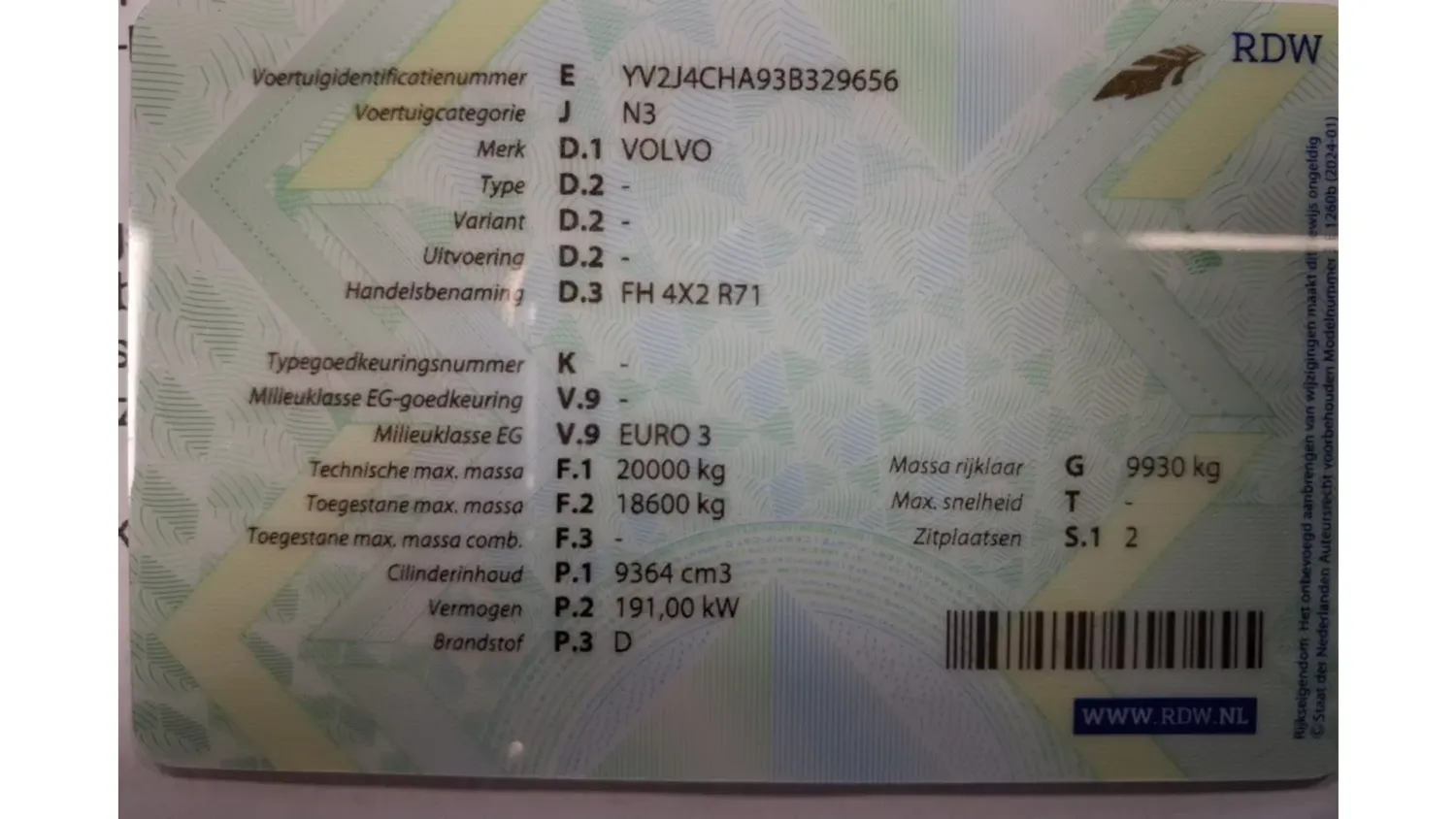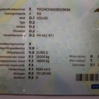 General information Year of construction: 2002 Cab: day Reference number: Zeilbak Volvo FM 9.260 Registration number: 67-BFN-7 Technical information Number of cylinders: 6 Max. front axle load: 7100 kg Max. rear axle load: 11500 kg Fuel tank: 600 litres Measures and weights Empty weight: 9.830 kg GVW: 20.000 kg Wheelbase: 520 cm Functional Dimensions of cargo space: 715 x 251 x 252 cm Tail lift: DHollandia, 2000 kg Condition General condition: good Technical condition: good Additional information Please contact Vitali Lenda (+31 6 20260621, verkoop@toonnetten.nl) for more information