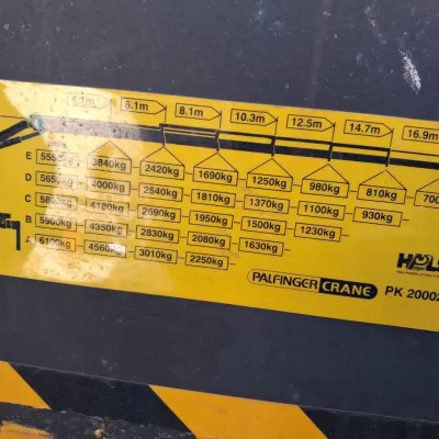 General information Bodywork: Open body Year of construction: 2000 Reference number: Scania 94 + Palfinger Technical information Number of cylinders: 6 Transmission: GR, Manual gearbox Fuel tank: 600 litres Measures and weights Empty weight: 10.350 kg GVW: 19.000 kg Wheelbase: 530 cm Functional Crane: Palfinger PK20002 * Radiosteering * 5 x Hydraulics * ==> 16.9m, year of manufacture 2009, behind the cab Financial information Price: On request Additional information Please contact Vitali Lenda (+31 6 20260621, verkoop@toonnetten.nl) for more information