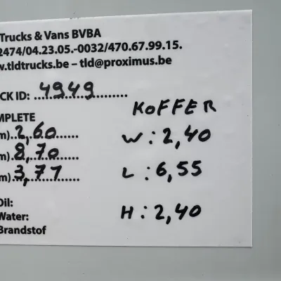 General information Year of construction: 2009 Cab: day Reference number: 4949 Technical information AdBlue system: Yes Front axle: Steering; Suspension: leaf suspension Rear axle: Double wheels; Suspension: air suspension Empty weight: 6.780 kg GVW: 11.900 kg Functional Dimensions of cargo space: 655 x 240 x 240 cm Tail lift: tail lift, 1500 kg Condition General condition: very good Technical condition: very good Visual appearance: very good Additional information Please contact Thierry Leemans (+32474042305, tld@proximus.be) for more information BELGIAN TRUCK AIRCO VERRY CLEAN TRUCK