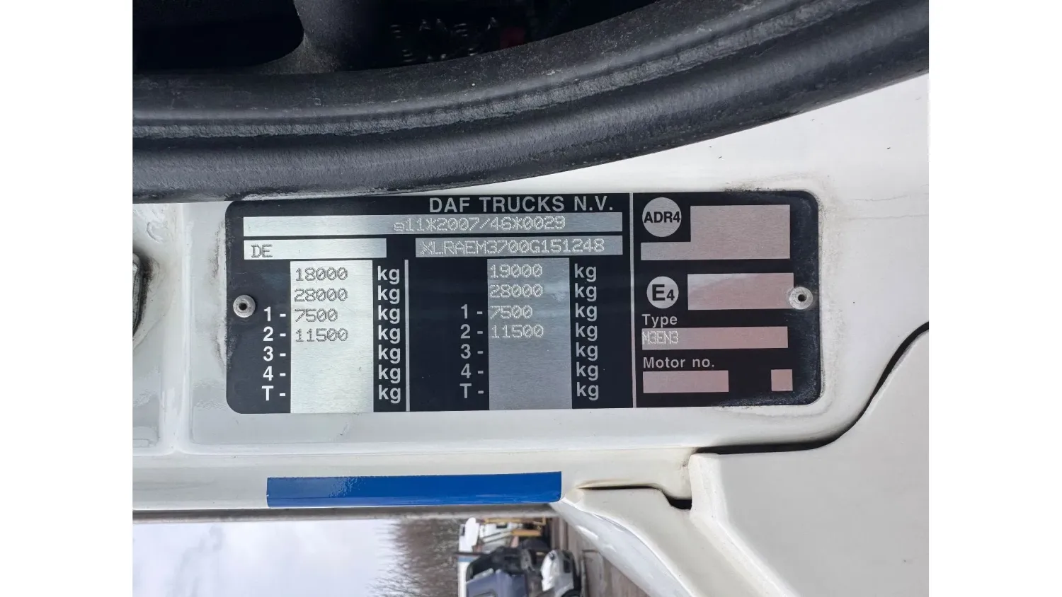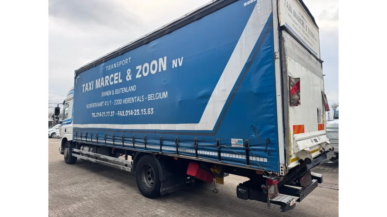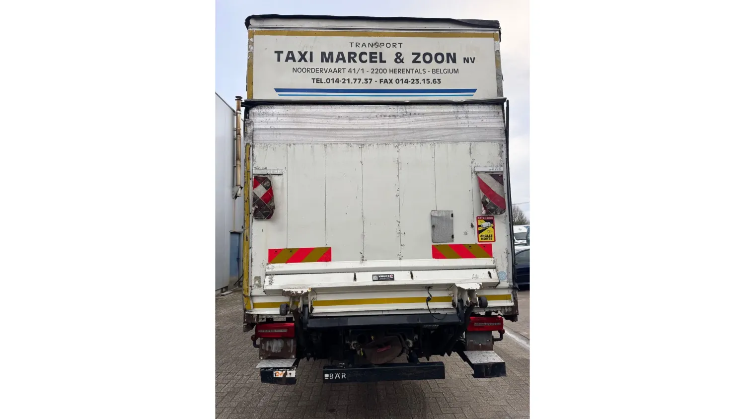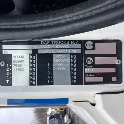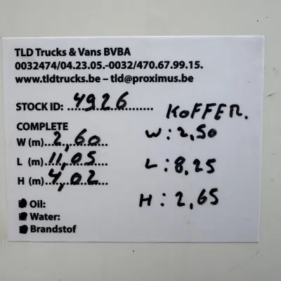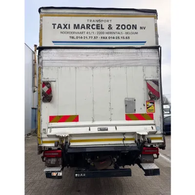 General information Year of construction: 2017 Reference number: 4926 Technical information Number of cylinders: 6 AdBlue system: Yes Front axle: Steering; Suspension: leaf suspension Rear axle: Double wheels; Suspension: air suspension Empty weight: 9.284 kg GVW: 19.000 kg Functional Dimensions of cargo space: 856 x 250 x 265 cm Tail lift: BAR, tail lift Condition General condition: very good Technical condition: very good Visual appearance: very good Additional information Please contact Thierry Leemans (+32474042305, tld@proximus.be) for more information BELGIAN ORIGINE VERRY GOOD CONDITION