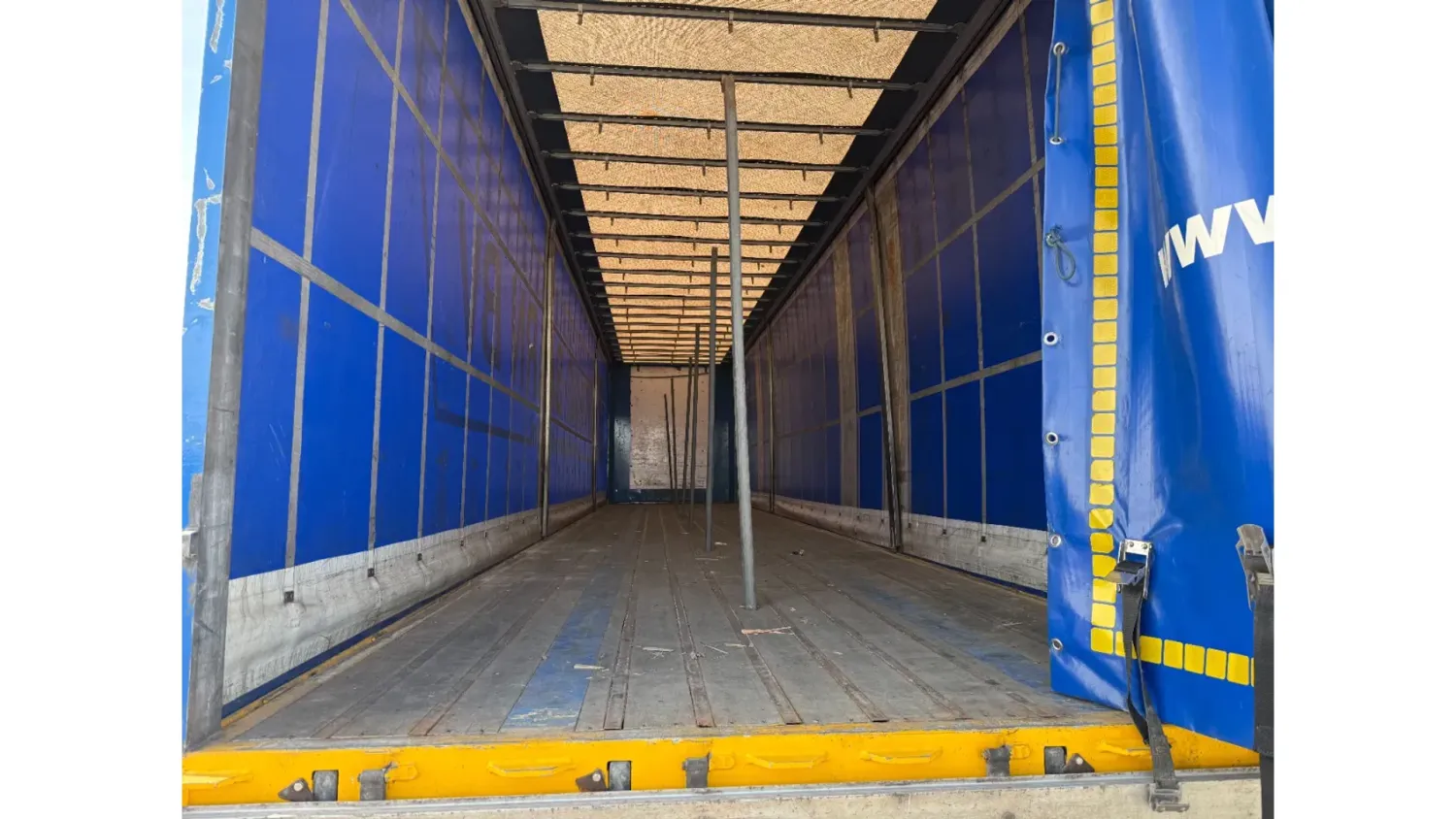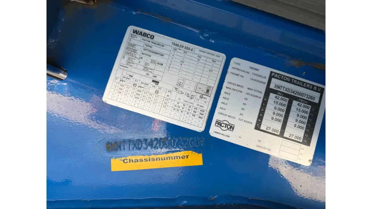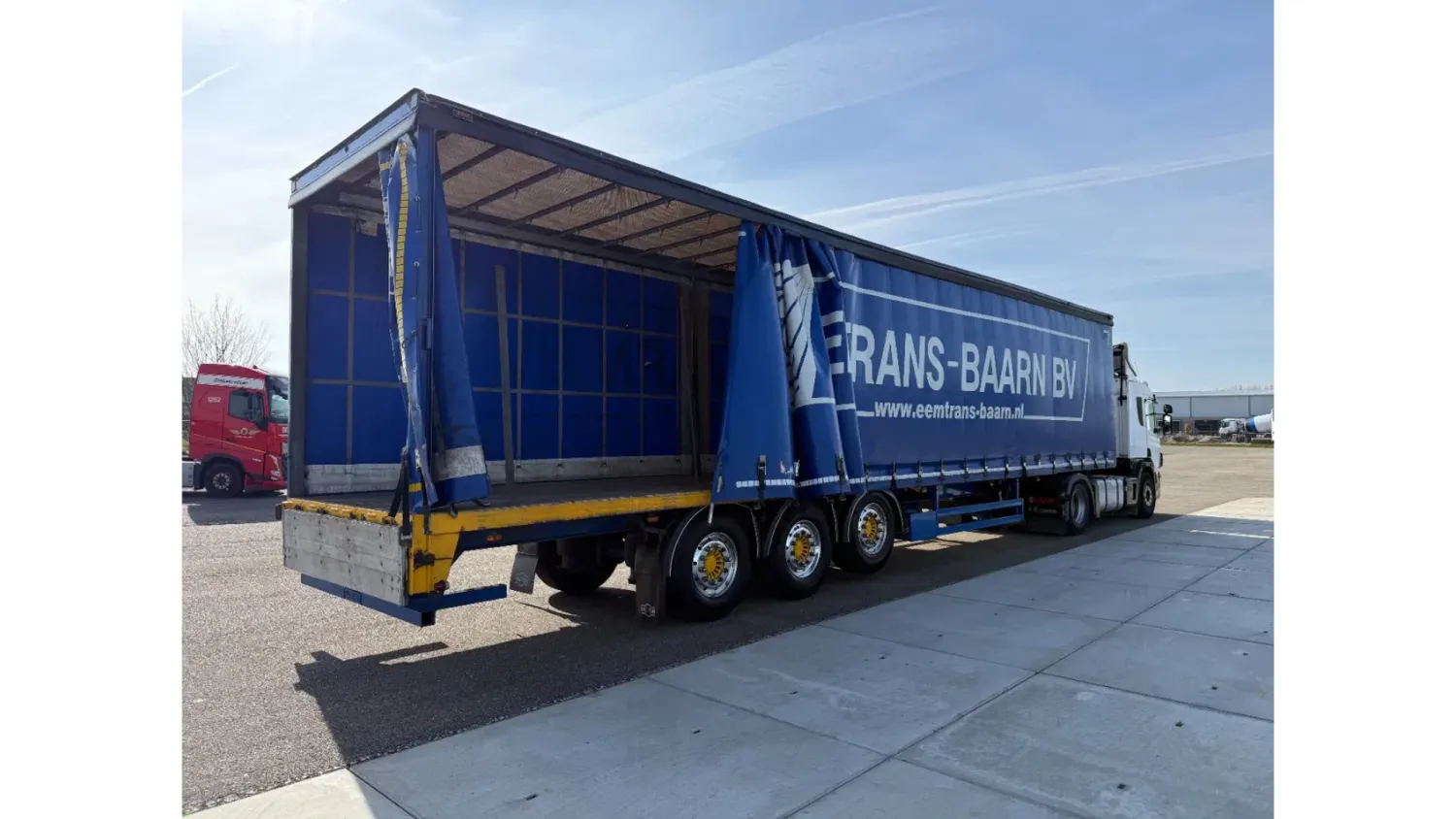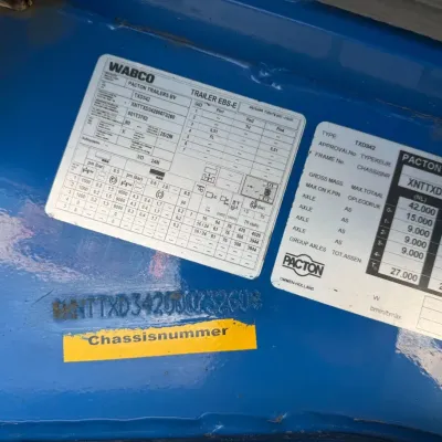 General information Year of construction: 2015 Registration number: ON-30-TH Axle configuration Rear axle 1: Alloy wheels; Lift axle; Max. axle load: 9000 kg Rear axle 2: Alloy wheels; Max. axle load: 9000 kg Rear axle 3: Alloy wheels; Max. axle load: 9000 kg Measures and weights Empty weight: 7.305 kg GVW: 42.000 kg Wheelbase: 911 cm Maintenance APK (MOT): tested until 12/2026 Condition General condition: very good Technical condition: very good Visual appearance: very good