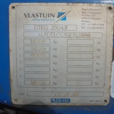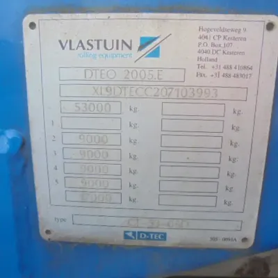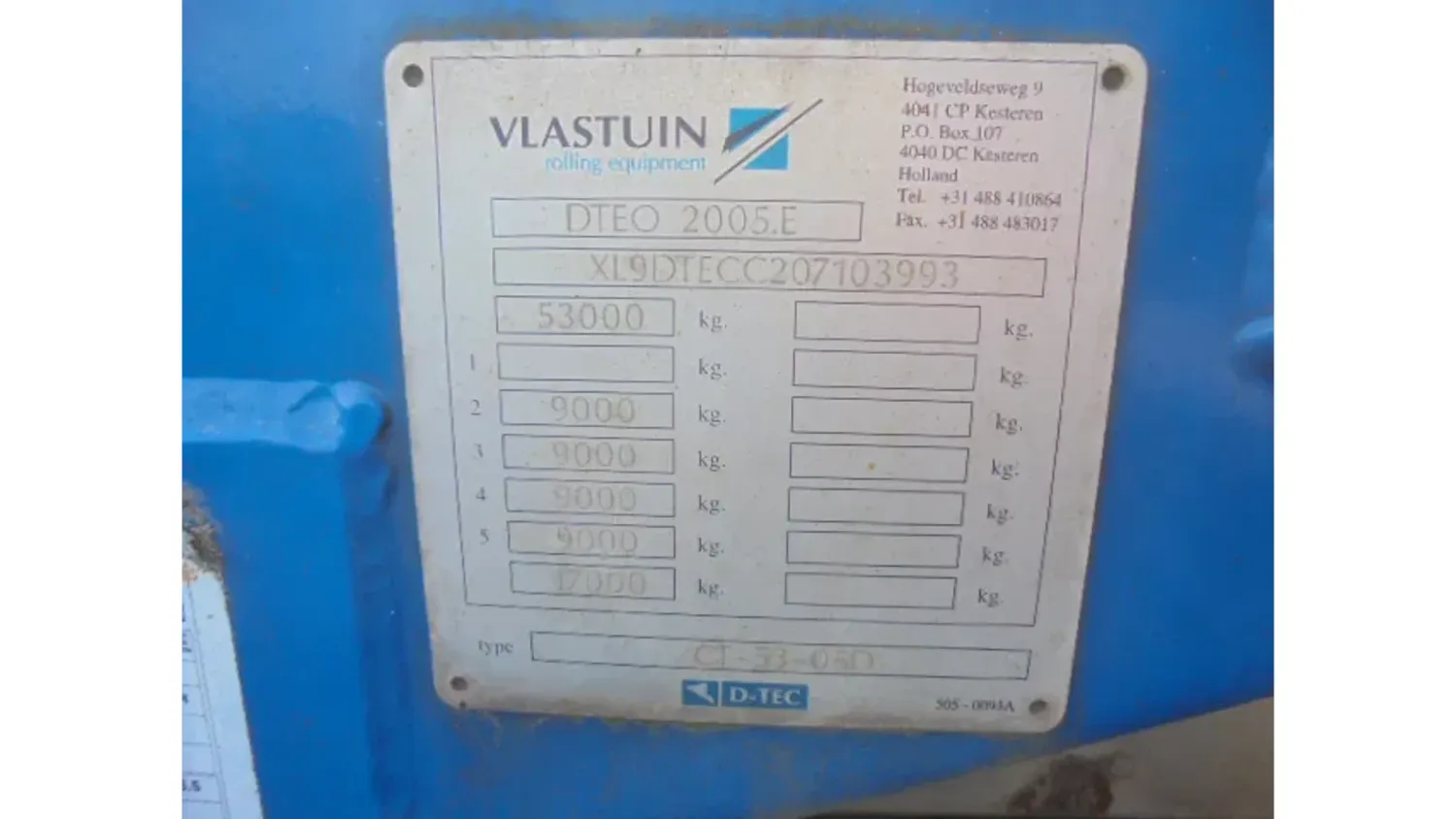General information Year of construction: 2007 Reference number: 5574 Axle configuration Rear axle 1: Tyre size: 385/55R22.5; Lift axle; Max. axle load: 9000 kg; Steering; Make axles: BPW ECO Rear axle 2: Tyre size: 385/55R22.5; Lift axle; Max. axle load: 9000 kg; Steering; Make axles: BPW Rear axle 3: Tyre size: 385/65R22.5; Lift axle; Max. axle load: 9000 kg; Make axles: BPW ECO Rear axle 4: Tyre size: 385/65R22.5; Max. axle load: 9000 kg; Make axles: BPW ECO Rear axle 5: Tyre size: 385/65R.22.5; Lift axle; Max. axle load: 9000 kg; Steering; Make axles: BPW ECO Measures and weights Empty weight: 8.300 kg GVW: 53.000 kg Wheelbase: 987 cm Maintenance APK (MOT): tested until 10/2026 Condition General condition: very good Technical condition: very good Visual appearance: good = Dealer information = WWW.DENOTTERTRUCKS.COM