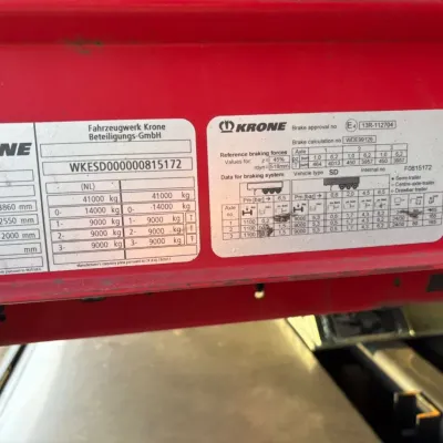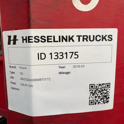 General information Year of construction: 2018 Reference number: 133175 Registration number: OR-81-GN Axle configuration Rear axle 1: Max. axle load: 9000 kg; Tyre profile left: 40%; Tyre profile right: 40% Rear axle 2: Max. axle load: 9000 kg; Tyre profile left: 50%; Tyre profile right: 50% Rear axle 3: Max. axle load: 9000 kg; Tyre profile left: 40%; Tyre profile right: 40% Measures and weights Empty weight: 7.670 kg GVW: 41.000 kg Wheelbase: 890 cm Maintenance APK (MOT): tested until 06/2026 Condition General condition: very good Technical condition: very good Visual appearance: very good Damages: none