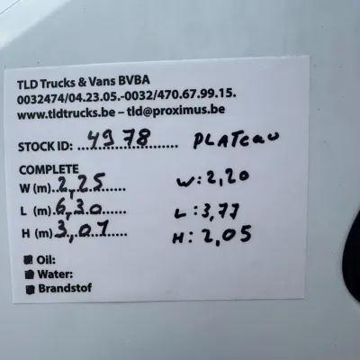 General information Type of body: Tarpaulin Year of construction: 2009 Cab: day Reference number: 4978 Technical information Type of fuel: Diesel Front axle: Steering Rear axle: Double wheels Empty weight: 2.680 kg GVW: 3.500 kg Functional Dimensions of cargo space: 377 x 220 x 205 cm Condition General condition: very good Technical condition: very good Visual appearance: very good Financial information VAT/margin: VAT qualifying Additional information Please contact Thierry Leemans (+32474042305, tld@proximus.be) for more information BELGIAN ORIGINE VERRY CLEAN TRUCK