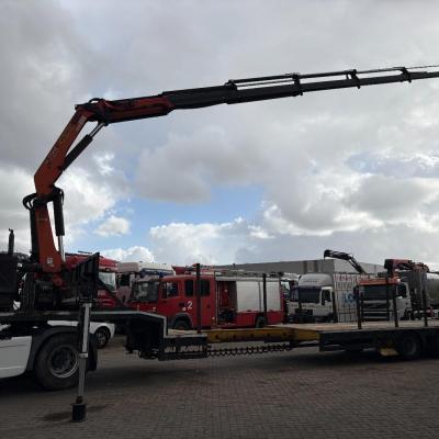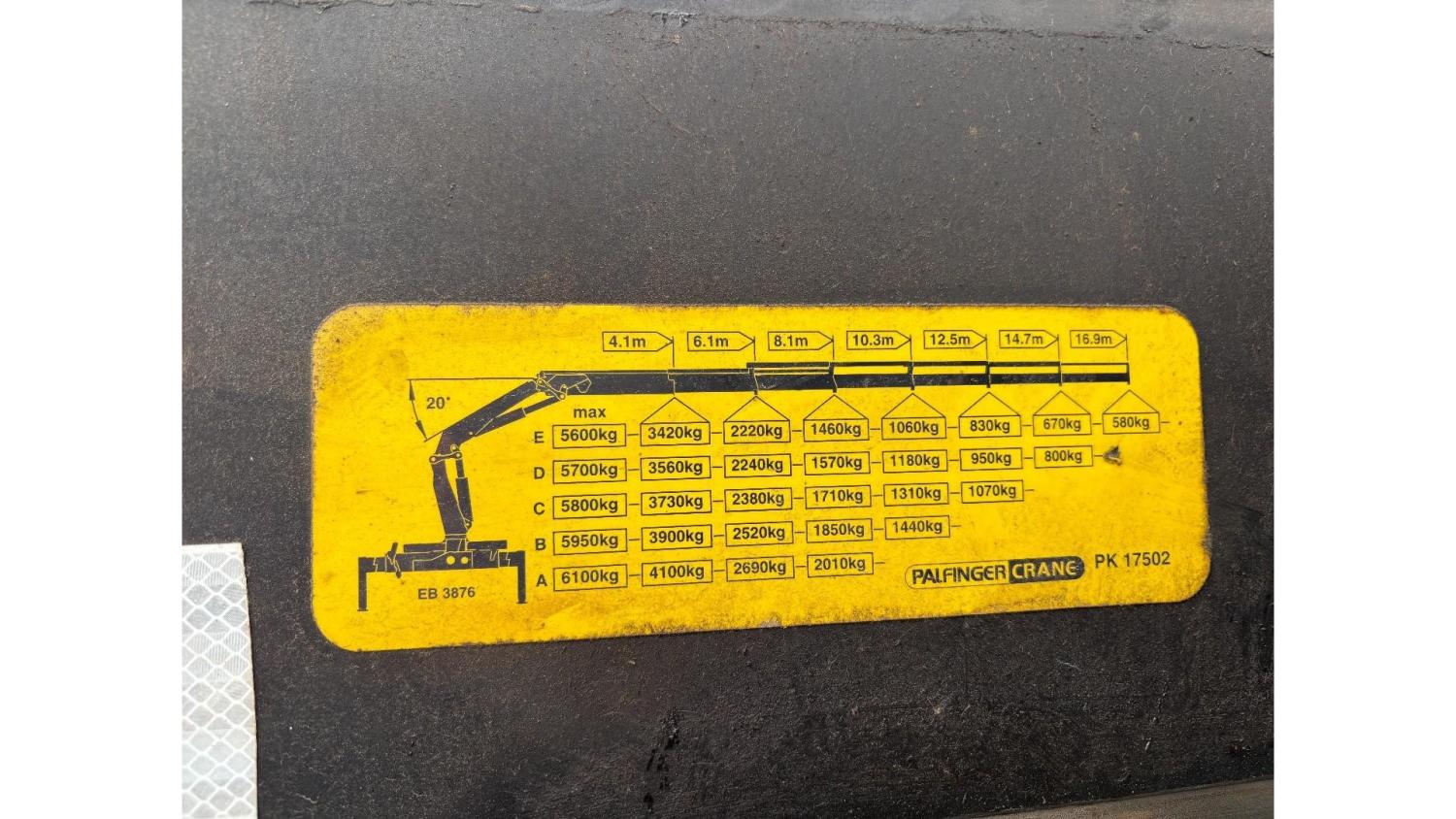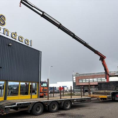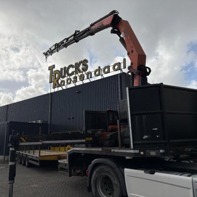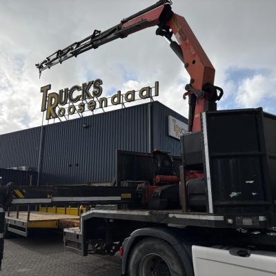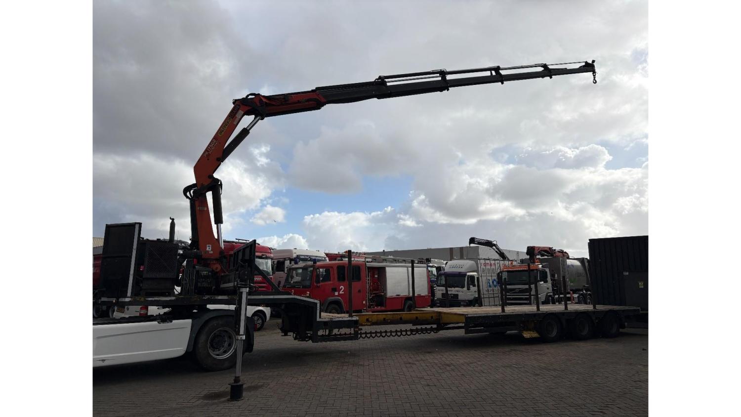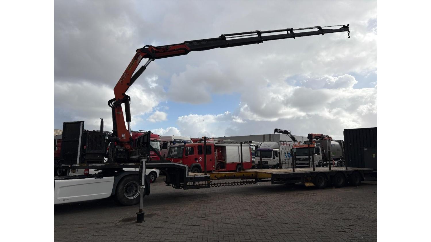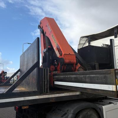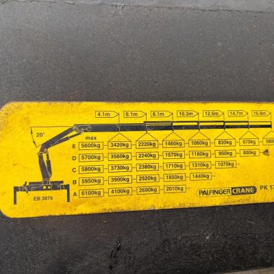 General information Year of construction: 2000 Axle configuration Rear axle 1: Double wheels; Max. axle load: 9000 kg; Steering Rear axle 2: Double wheels; Max. axle load: 9000 kg; Steering Rear axle 3: Double wheels; Max. axle load: 9000 kg; Steering Weights Empty weight: 9.950 kg GVW: 39.000 kg Functional Dimensions of cargo space: 1810 x 250 x 90 cm Crane: PALFINGER 17502, year of manufacture 2009, behind the cab Make of bodywork: PALFINGER 17502 Height of cargo floor: 90 cm Maintenance APK (MOT): tested until 09/2026 Condition General condition: very good Technical condition: very good Visual appearance: very good Identification Reference number: TR1728 Registration number: OR-33-ND Serial number: XL931N5SAYL007501 Structure Construction year: 2009 Crane Number of hydraulic extensions: 5 Remote control: ✓ Rotator: ✓ Meter capacity: 15 m Capacity kilo: 5700 kg