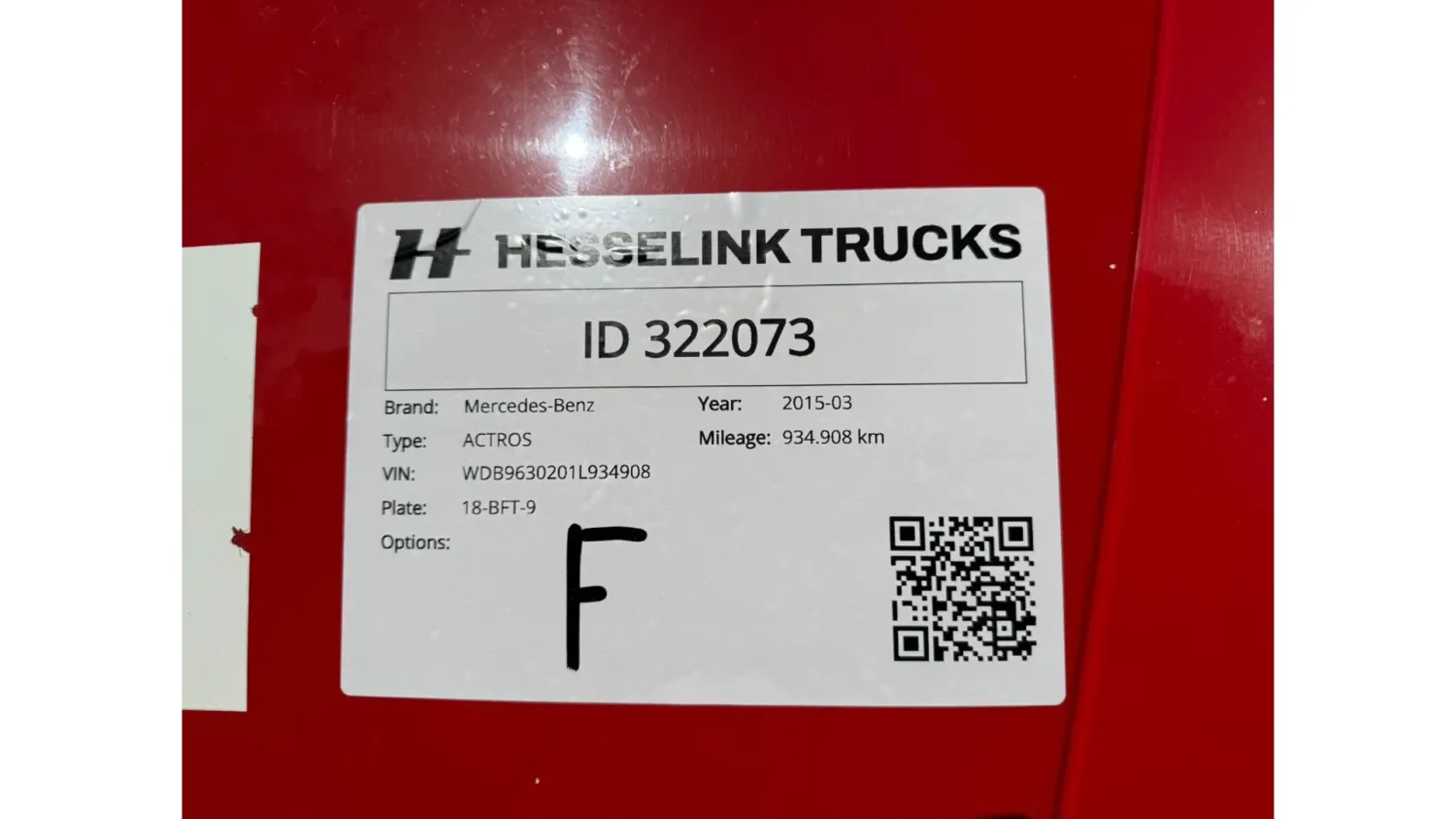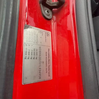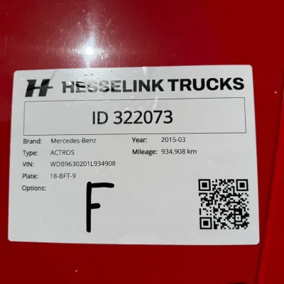 General information Year of construction: 2015 Reference number: 322073 Registration number: 18-BFT-9 Technical information Number of cylinders: 6 Drivetrain AdBlue system: Yes Axle configuration Brakes: disc brakes Front axle: Max. axle load: 7500 kg; Steering; Tyre profile left: 60%; Tyre profile right: 60% Rear axle 1: Max. axle load: 11500 kg; Tyre profile left: 40%; Tyre profile right: 40% Rear axle 2: Max. axle load: 7500 kg; Tyre profile left: 60%; Tyre profile right: 60% Measures and weights Empty weight: 11.855 kg GVW: 26.500 kg Wheelbase: 655 cm Maintenance APK (MOT): tested until 11/2026 Condition General condition: very good Technical condition: very good Visual appearance: very good Damages: none
