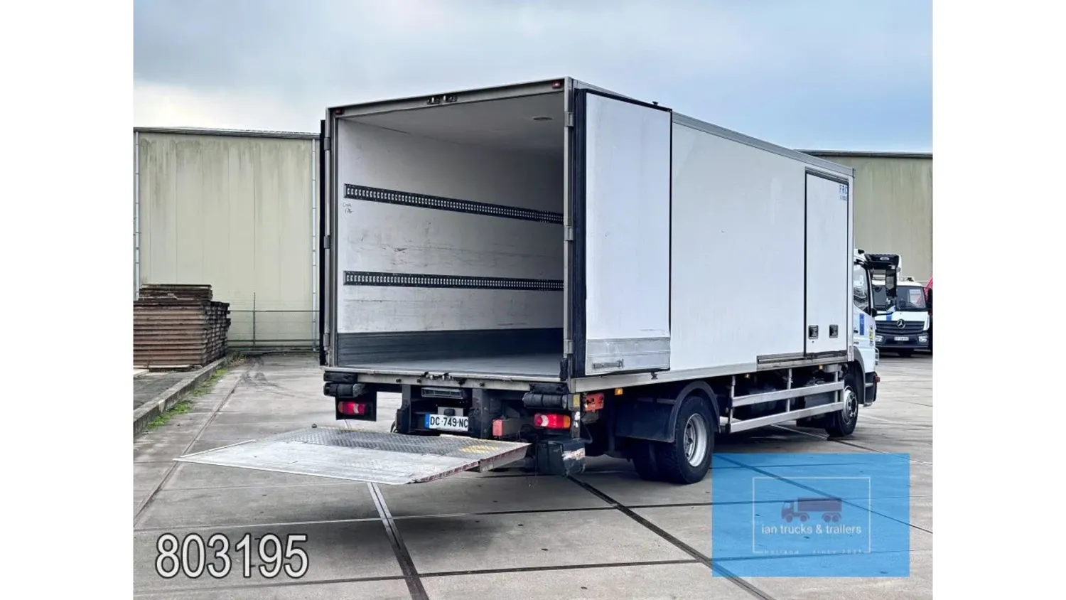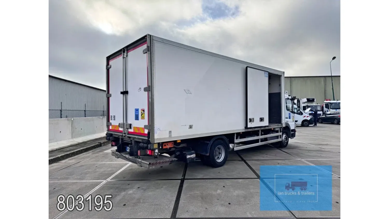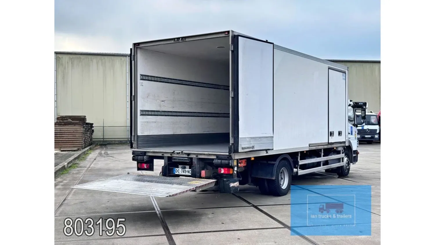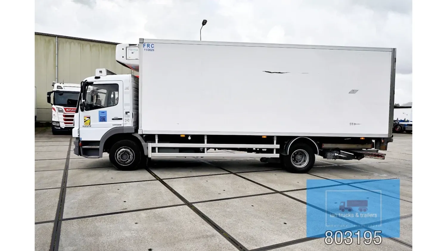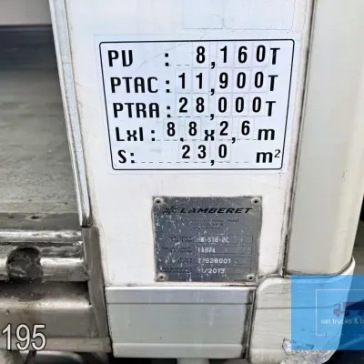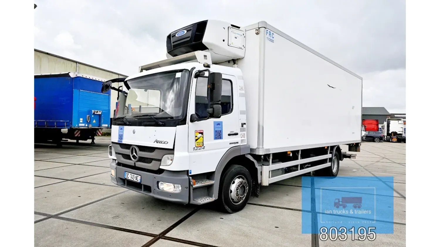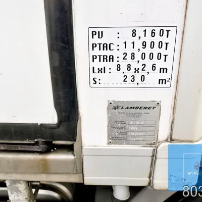 General information Year of construction: 2014 Cab: day Reference number: 803195K Technical information Number of cylinders: 6 Drivetrain AdBlue system: Yes Fuel tank: 125 litres Transmission Transmission: G 85-6/6,7-0,73, 6 gears, Manual gearbox Axle configuration Tyre size: 265/70R19,5 Brakes: disc brakes Front axle: Max. axle load: 4900 kg; Steering; Tyre profile left: 50%; Tyre profile right: 50%; Suspension: leaf suspension Rear axle: Double wheels; Max. axle load: 8100 kg; Tyre profile left inner: 50%; Tyre profile left outer: 50%; Tyre profile right outer: 50%; Tyre profile right outer: 50%; Suspension: air suspension Measures and weights Empty weight: 8.160 kg GVW: 11.990 kg Wheelbase: 476 cm Functional Dimensions of cargo space: 670 x 246 x 225 cm Tail lift: DHOLLANDIA DHSM.15, slider lift, 1500 kg Make of bodywork: LAMBERET SUPRA 850 Cooling engine: diesel and electric Wall thickness: 5 mm Condition General condition: good Technical condition: good Visual appearance: good Damages: none Other information Cool unit make: Carrier Additional information Please contact Ian Anema (+31611159159, ian@iantrucks.com) for more information Mercedes-Benz Atego 1224 4x2 Refrigerated Truck – Euro 5 (2014) First registration: 28/01/2014 Chassis number: WDB9702571L803195 Mileage: 319,000 km ⸻ ⚙️ Technical specifications: • Engine: 240 hp Euro 5 Bluetec 5 / EEV OM 936 6 cylinder • Transmission: 6-speed manual • Drive: 4x2 • Suspension: Leaf springs front, air suspension rear • Wheelbase: 476 cm ⸻ ❄️ Body & equipment: • Refrigeration unit: Carrier Supra 850 • Box dimensions: 670 x 246 x 225 cm • Tail lift: Dhollandia SM 1500 – 1,500 kg capacity • Cab: Day cab with air conditioning • Colour: Original white Cool unit brand: Carrier