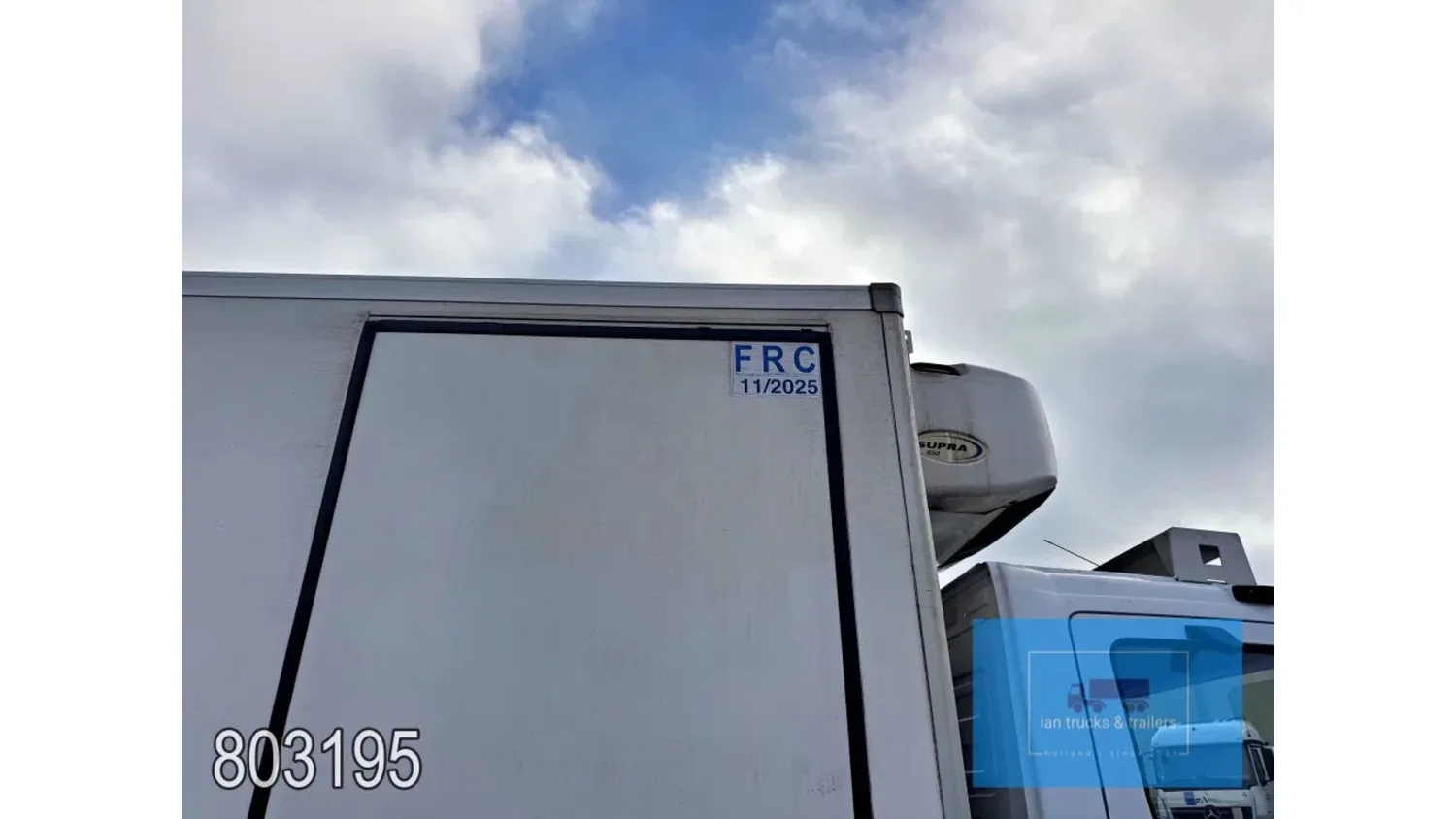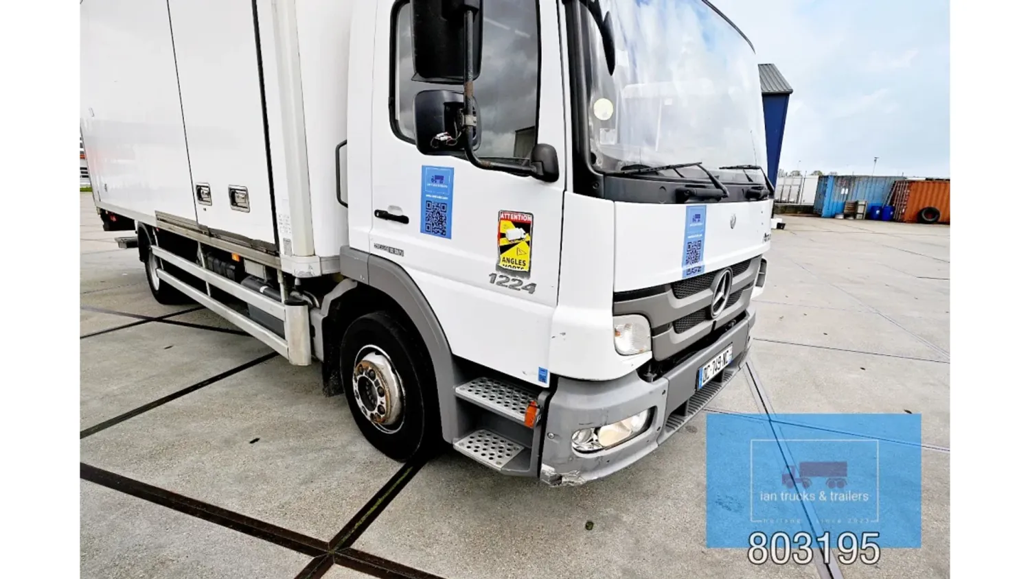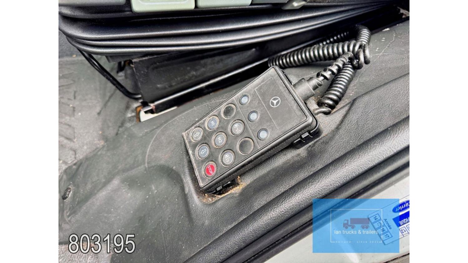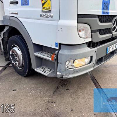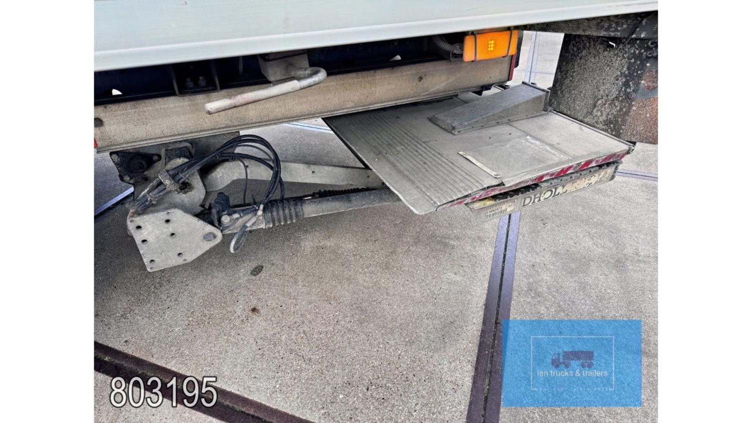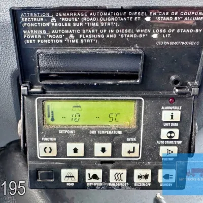 General information Year of construction: 2014 Cab: day Reference number: 803195K Technical information Number of cylinders: 6 Drivetrain AdBlue system: Yes Fuel tank: 125 litres Transmission Transmission: G 85-6/6,7-0,73, 6 gears, Manual gearbox Axle configuration Tyre size: 265/70R19,5 Brakes: disc brakes Front axle: Max. axle load: 4900 kg; Steering; Tyre profile left: 50%; Tyre profile right: 50%; Suspension: leaf suspension Rear axle: Double wheels; Max. axle load: 8100 kg; Tyre profile left inner: 50%; Tyre profile left outer: 50%; Tyre profile right outer: 50%; Tyre profile right outer: 50%; Suspension: air suspension Measures and weights Empty weight: 8.160 kg GVW: 11.990 kg Wheelbase: 476 cm Functional Dimensions of cargo space: 670 x 246 x 225 cm Tail lift: DHOLLANDIA DHSM.15, slider lift, 1500 kg Make of bodywork: LAMBERET SUPRA 850 Cooling engine: diesel and electric Wall thickness: 5 mm Condition General condition: good Technical condition: good Visual appearance: good Damages: none Other information Cool unit make: Carrier Additional information Please contact Ian Anema (+31611159159, ian@iantrucks.com) for more information Mercedes-Benz Atego 1224 4x2 Refrigerated Truck – Euro 5 (2014) First registration: 28/01/2014 Chassis number: WDB9702571L803195 Mileage: 319,000 km ⸻ ⚙️ Technical specifications: • Engine: 240 hp Euro 5 Bluetec 5 / EEV OM 936 6 cylinder • Transmission: 6-speed manual • Drive: 4x2 • Suspension: Leaf springs front, air suspension rear • Wheelbase: 476 cm ⸻ ❄️ Body & equipment: • Refrigeration unit: Carrier Supra 850 • Box dimensions: 670 x 246 x 225 cm • Tail lift: Dhollandia SM 1500 – 1,500 kg capacity • Cab: Day cab with air conditioning • Colour: Original white Cool unit brand: Carrier