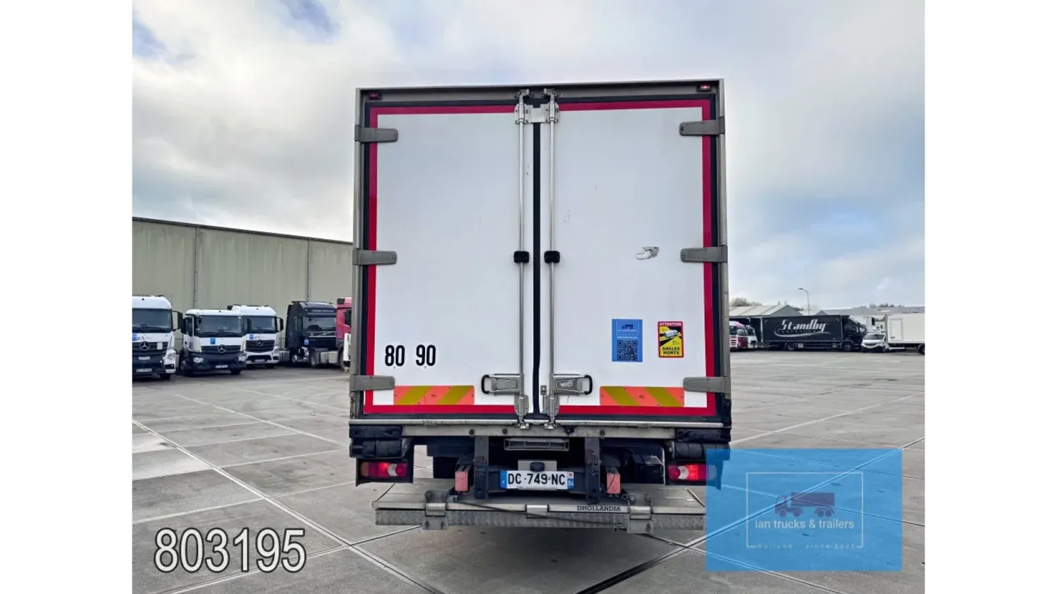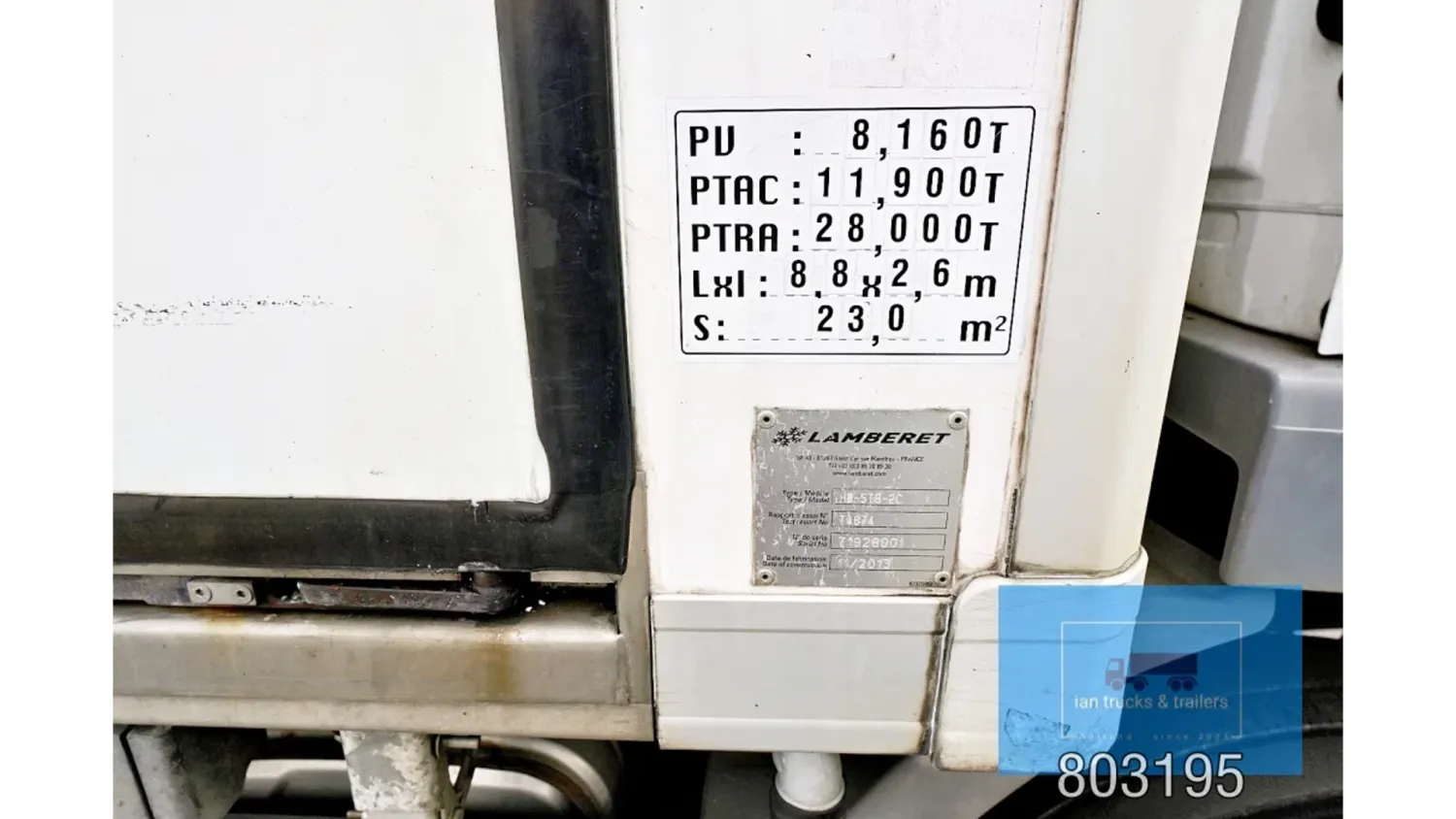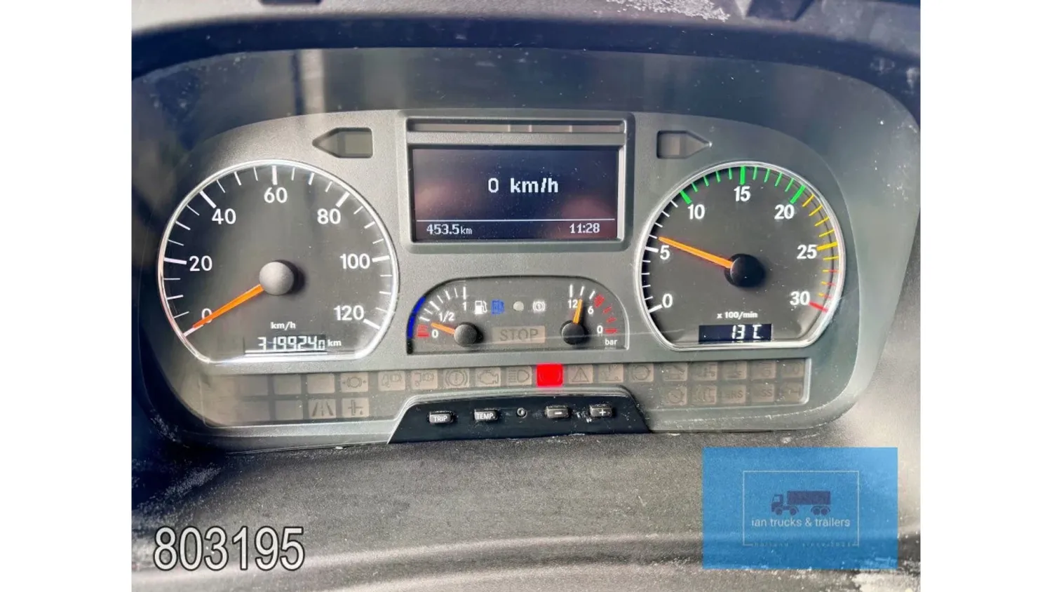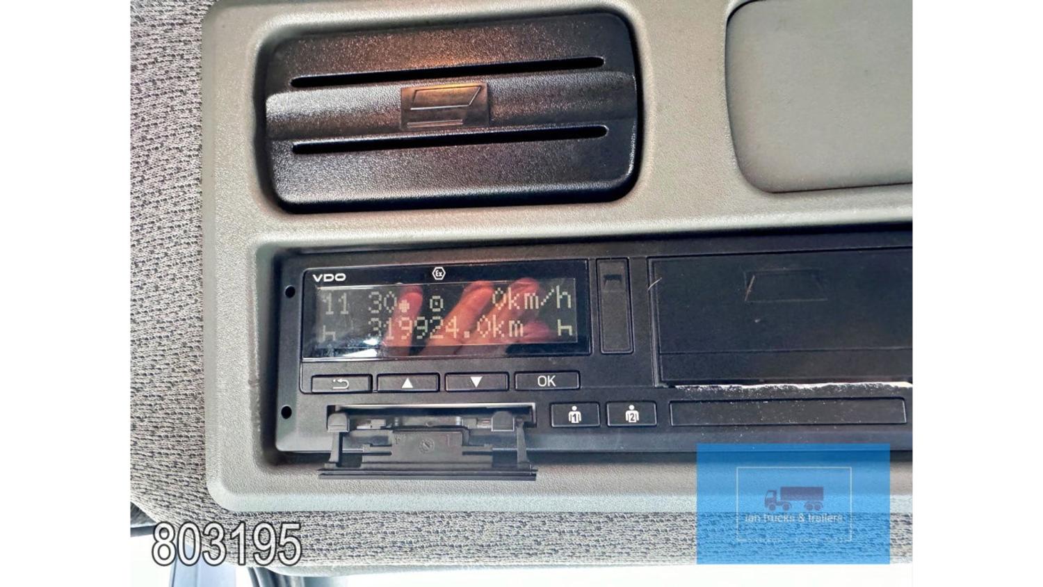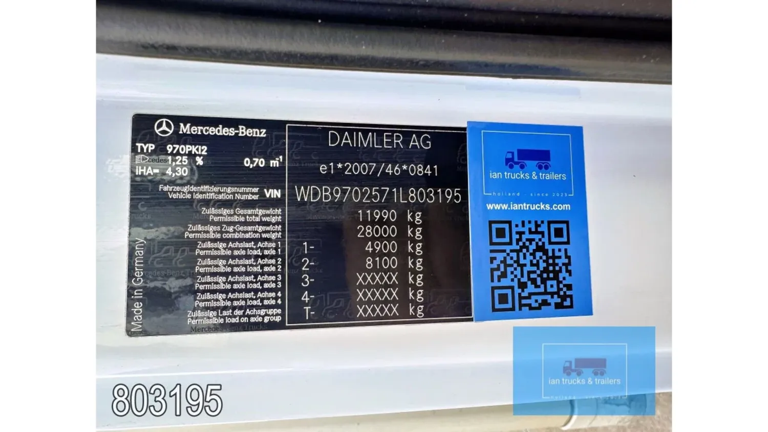 General information Year of construction: 2014 Cab: day Reference number: 803195K Technical information Number of cylinders: 6 Drivetrain AdBlue system: Yes Fuel tank: 125 litres Transmission Transmission: G 85-6/6,7-0,73, 6 gears, Manual gearbox Axle configuration Tyre size: 265/70R19,5 Brakes: disc brakes Front axle: Max. axle load: 4900 kg; Steering; Tyre profile left: 50%; Tyre profile right: 50%; Suspension: leaf suspension Rear axle: Double wheels; Max. axle load: 8100 kg; Tyre profile left inner: 50%; Tyre profile left outer: 50%; Tyre profile right outer: 50%; Tyre profile right outer: 50%; Suspension: air suspension Measures and weights Empty weight: 8.160 kg GVW: 11.990 kg Wheelbase: 476 cm Functional Dimensions of cargo space: 670 x 246 x 225 cm Tail lift: DHOLLANDIA DHSM.15, slider lift, 1500 kg Make of bodywork: LAMBERET SUPRA 850 Cooling engine: diesel and electric Wall thickness: 5 mm Condition General condition: good Technical condition: good Visual appearance: good Damages: none Other information Cool unit make: Carrier Additional information Please contact Ian Anema (+31611159159, ian@iantrucks.com) for more information Mercedes-Benz Atego 1224 4x2 Refrigerated Truck – Euro 5 (2014) First registration: 28/01/2014 Chassis number: WDB9702571L803195 Mileage: 319,000 km ⸻ ⚙️ Technical specifications: • Engine: 240 hp Euro 5 Bluetec 5 / EEV OM 936 6 cylinder • Transmission: 6-speed manual • Drive: 4x2 • Suspension: Leaf springs front, air suspension rear • Wheelbase: 476 cm ⸻ ❄️ Body & equipment: • Refrigeration unit: Carrier Supra 850 • Box dimensions: 670 x 246 x 225 cm • Tail lift: Dhollandia SM 1500 – 1,500 kg capacity • Cab: Day cab with air conditioning • Colour: Original white Cool unit brand: Carrier