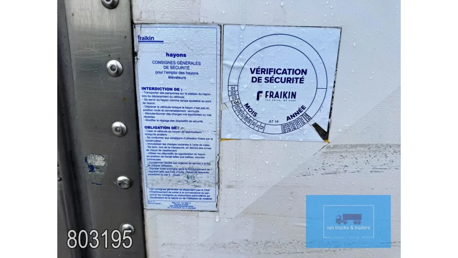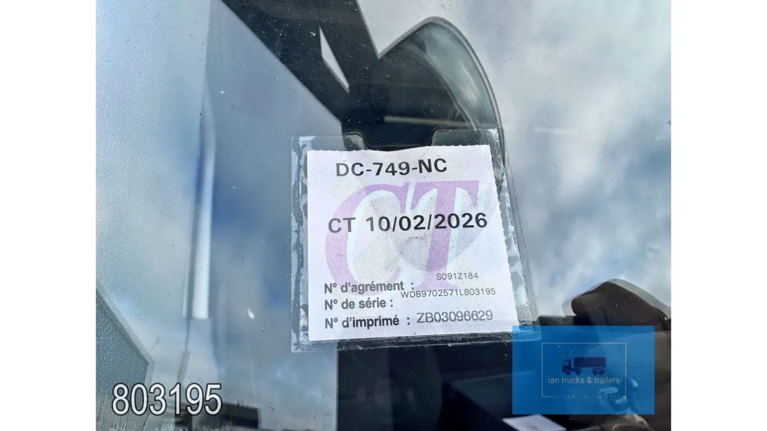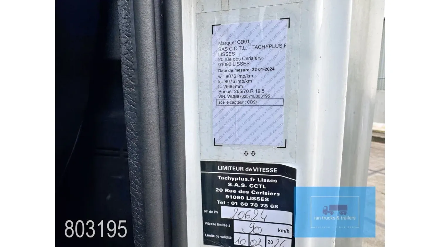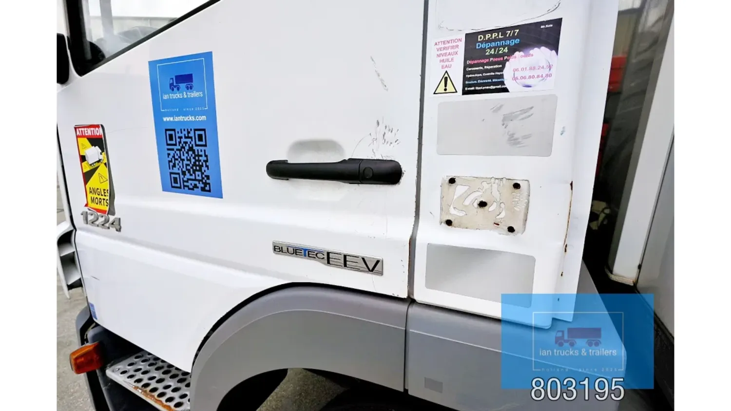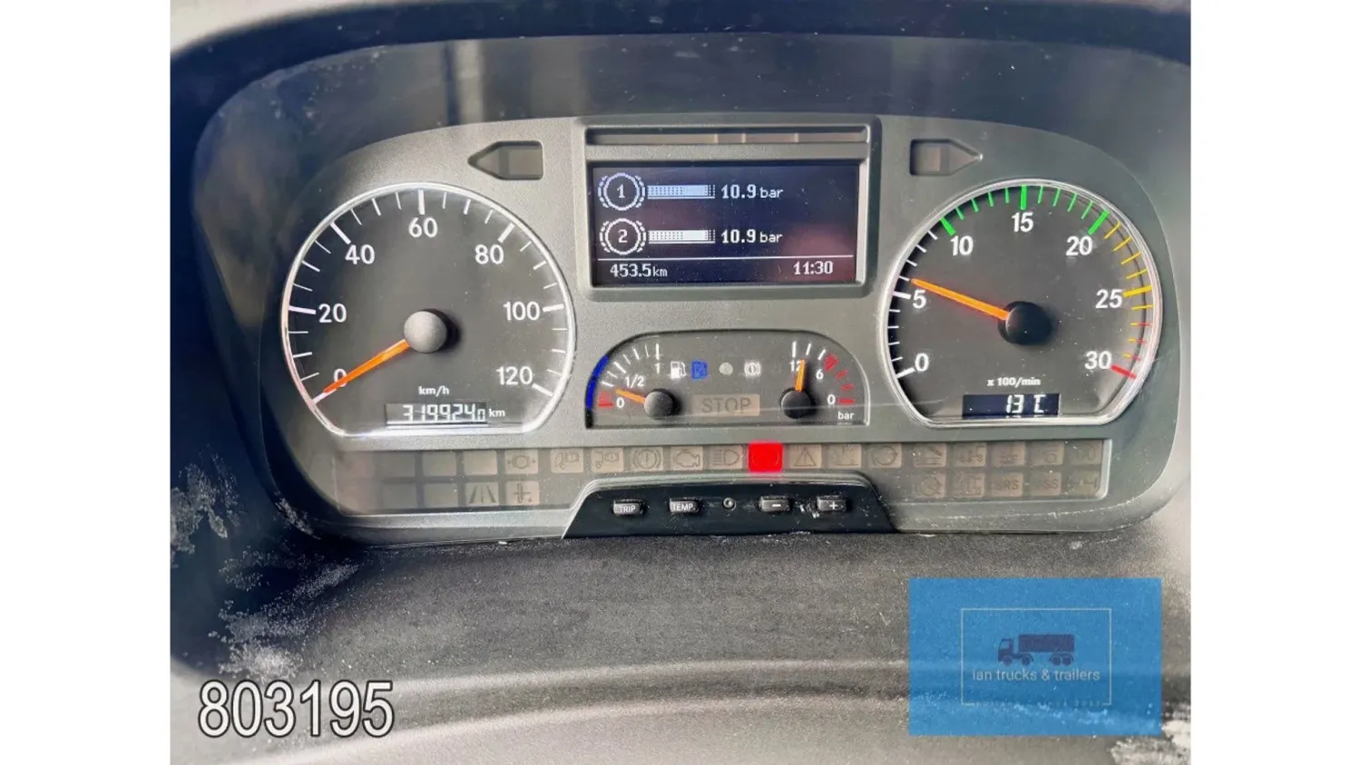 General information Year of construction: 2014 Cab: day Reference number: 803195K Technical information Number of cylinders: 6 Drivetrain AdBlue system: Yes Fuel tank: 125 litres Transmission Transmission: G 85-6/6,7-0,73, 6 gears, Manual gearbox Axle configuration Tyre size: 265/70R19,5 Brakes: disc brakes Front axle: Max. axle load: 4900 kg; Steering; Tyre profile left: 50%; Tyre profile right: 50%; Suspension: leaf suspension Rear axle: Double wheels; Max. axle load: 8100 kg; Tyre profile left inner: 50%; Tyre profile left outer: 50%; Tyre profile right outer: 50%; Tyre profile right outer: 50%; Suspension: air suspension Measures and weights Empty weight: 8.160 kg GVW: 11.990 kg Wheelbase: 476 cm Functional Dimensions of cargo space: 670 x 246 x 225 cm Tail lift: DHOLLANDIA DHSM.15, slider lift, 1500 kg Make of bodywork: LAMBERET SUPRA 850 Cooling engine: diesel and electric Wall thickness: 5 mm Condition General condition: good Technical condition: good Visual appearance: good Damages: none Other information Cool unit make: Carrier Additional information Please contact Ian Anema (+31611159159, ian@iantrucks.com) for more information Mercedes-Benz Atego 1224 4x2 Refrigerated Truck – Euro 5 (2014) First registration: 28/01/2014 Chassis number: WDB9702571L803195 Mileage: 319,000 km ⸻ ⚙️ Technical specifications: • Engine: 240 hp Euro 5 Bluetec 5 / EEV OM 936 6 cylinder • Transmission: 6-speed manual • Drive: 4x2 • Suspension: Leaf springs front, air suspension rear • Wheelbase: 476 cm ⸻ ❄️ Body & equipment: • Refrigeration unit: Carrier Supra 850 • Box dimensions: 670 x 246 x 225 cm • Tail lift: Dhollandia SM 1500 – 1,500 kg capacity • Cab: Day cab with air conditioning • Colour: Original white Cool unit brand: Carrier