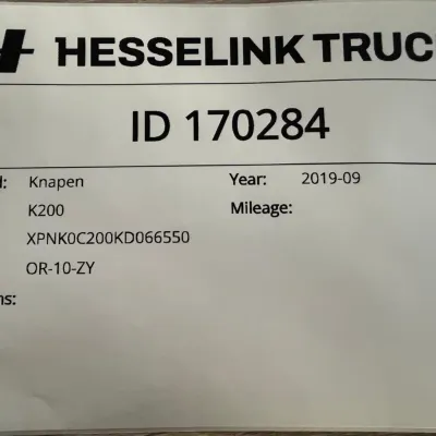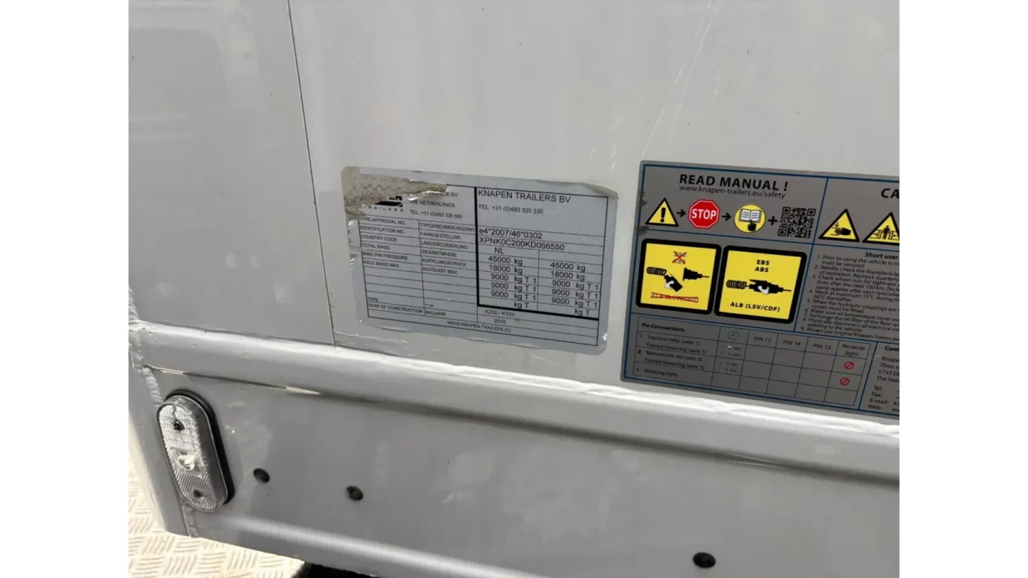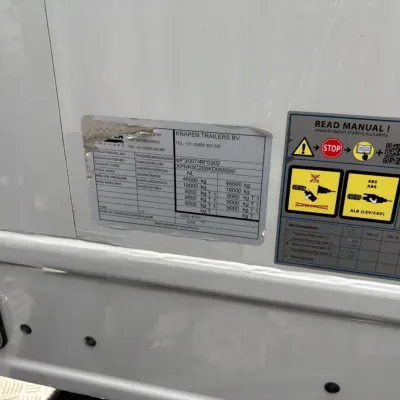 General information Year of construction: 2019 Reference number: 170284 Registration number: OR-10-ZY Axle configuration Rear axle 1: Max. axle load: 9000 kg; Tyre profile left: 70%; Tyre profile right: 70% Rear axle 2: Max. axle load: 9000 kg; Tyre profile left: 70%; Tyre profile right: 70% Rear axle 3: Max. axle load: 9000 kg; Tyre profile left: 30%; Tyre profile right: 30% Measures and weights Empty weight: 7.000 kg GVW: 45.000 kg Wheelbase: 750 cm Maintenance APK (MOT): tested until 09/2026 Condition General condition: very good Technical condition: very good Visual appearance: very good Damages: none