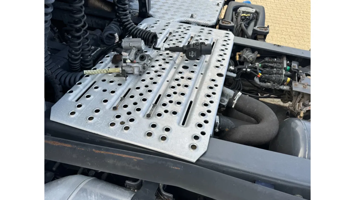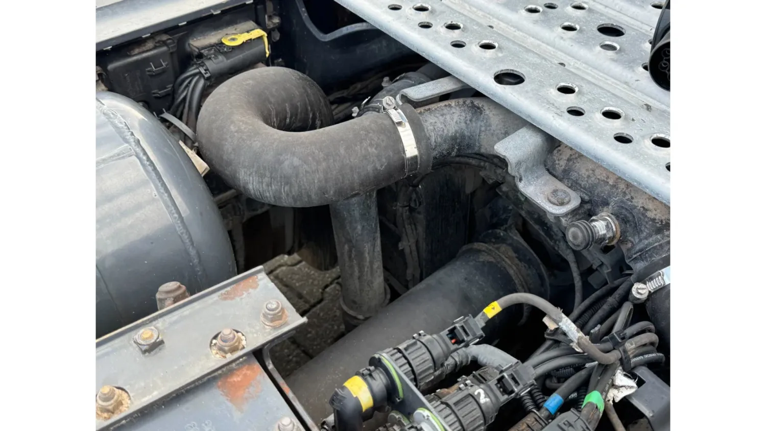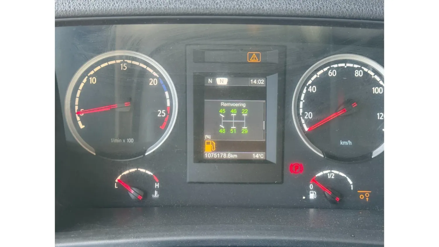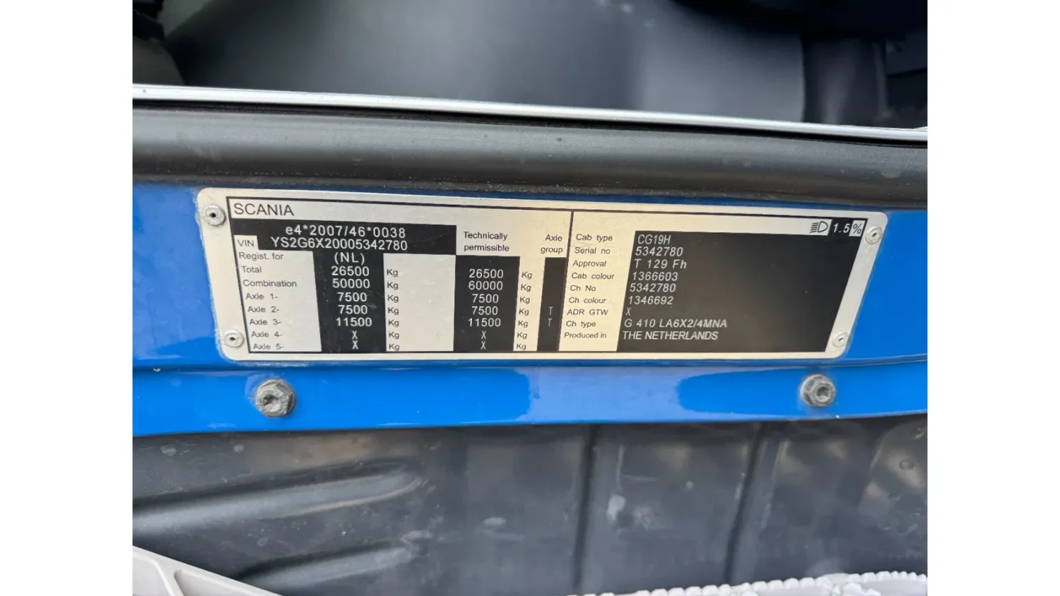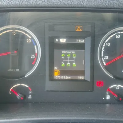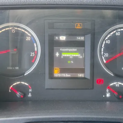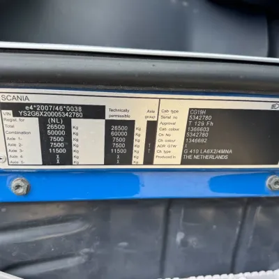 General information Bodywork: Standard tractor Year of construction: 2013 Reference number: 31837 Registration number: 15-BDL-5 Technical information Number of cylinders: 6 Drivetrain AdBlue system: Yes Axle configuration Max. front axle load: 7500 kg Rear axle 1: Lift axle; Max. axle load: 7500 kg Rear axle 2: Max. axle load: 11500 kg Measures and weights Empty weight: 8.590 kg GVW: 26.500 kg Wheelbase: 405 cm Maintenance APK (MOT): tested until 08/2026 Condition General condition: good Technical condition: good Visual appearance: good