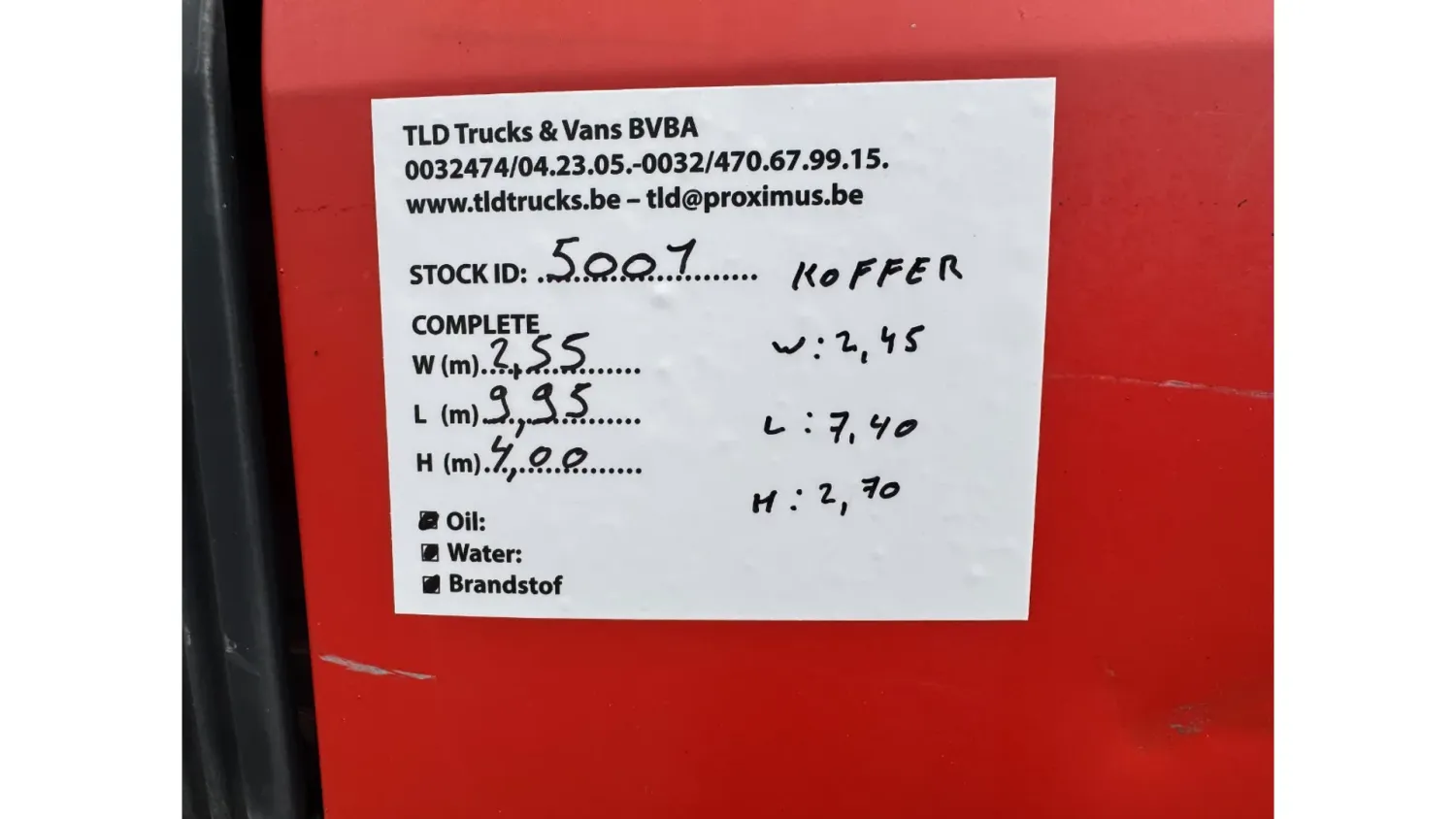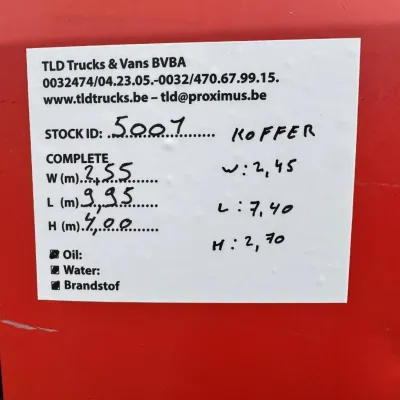 General information Year of construction: 2001 Reference number: 5001 Axle configuration Suspension: leaf suspension Front axle: Steering Rear axle: Double wheels Weights Empty weight: 8.340 kg GVW: 11.990 kg Functional Dimensions of cargo space: 740 x 245 x 270 cm Tail lift: slider lift Condition General condition: very good Technical condition: very good Visual appearance: very good Additional information Please contact Thierry Leemans (+32474042305, tld@proximus.be) for more information