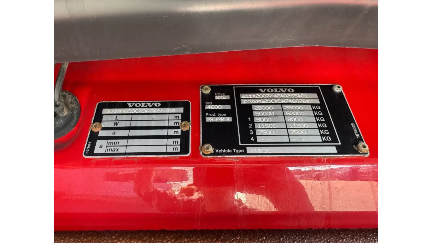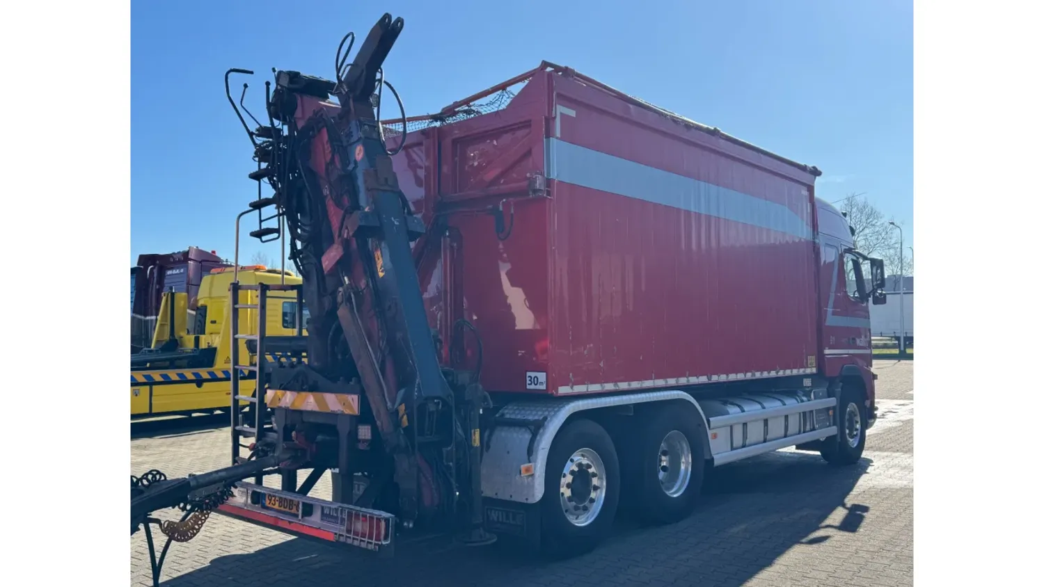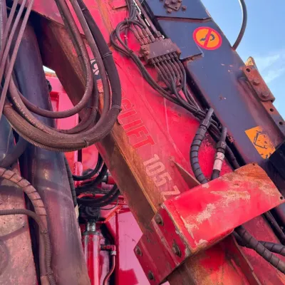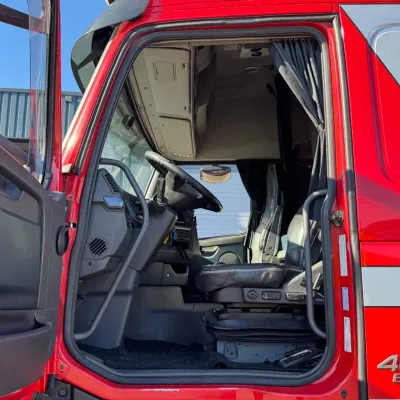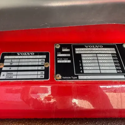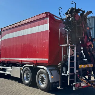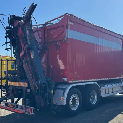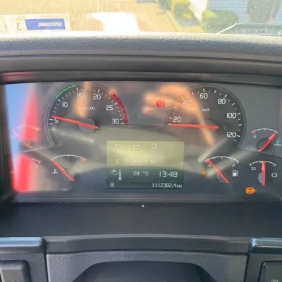 General information Year of construction: 2013 Reference number: 31664 Registration number: 93-BDB-6 Technical information Number of cylinders: 6 Drivetrain AdBlue system: Yes Transmission Transmission: I-SHIFT, Automatic Axle configuration Front axle: Tyre size: 385/65R22.5; Max. axle load: 9000 kg; Steering; Tyre profile left: 20%; Tyre profile right: 20% Rear axle 1: Tyre size: 315/80R22.5; Double wheels; Max. axle load: 11500 kg; Tyre profile left inner: 40%; Tyre profile left outer: 40%; Tyre profile right outer: 40%; Tyre profile right outer: 40% Rear axle 2: Tyre size: 385/65R22.5; Lift axle; Max. axle load: 7500 kg; Tyre profile left: 90%; Tyre profile right: 90% Measures and weights Empty weight: 15.660 kg GVW: 28.000 kg Wheelbase: 460 cm Functional Crane: Loglift 105Z, on rear of chassis Maintenance APK (MOT): tested until 09/2026 Condition General condition: good Technical condition: good Visual appearance: good