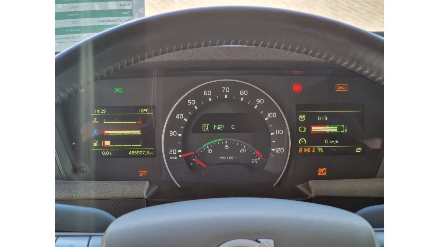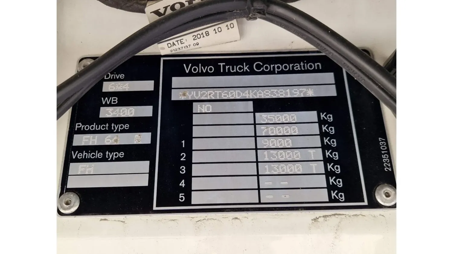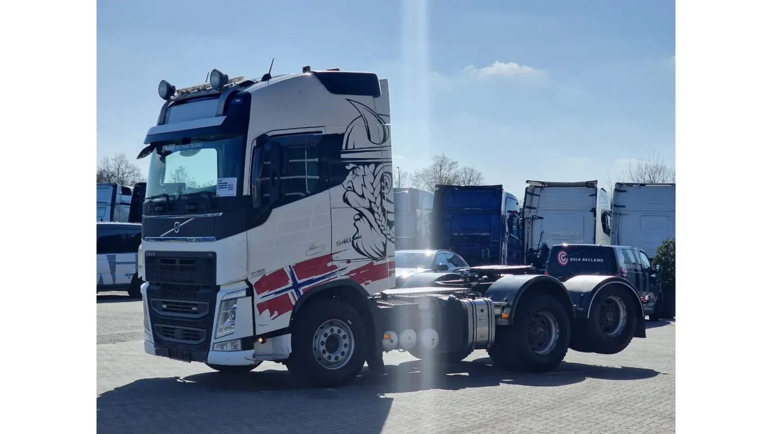 General information Bodywork: Standard tractor Year of construction: 2019 Reference number: H290364 Technical information Number of cylinders: 6 Transmission Transmission: I shift Dual Clutch , 12 gears, Automatic Axle configuration Suspension: air suspension Front axle: Tyre size: 385/65R22.5; Max. axle load: 9000 kg; Steering; Tyre profile left: 50%; Tyre profile right: 50% Rear axle 1: Tyre size: 315/80R22.5; Double wheels; Max. axle load: 13000 kg; Tyre profile left inner: 60%; Tyre profile left outer: 60%; Tyre profile right outer: 60%; Tyre profile right outer: 60%; Reduction: hub reduction Rear axle 2: Tyre size: 315/80R22.5; Double wheels; Lift axle; Max. axle load: 13000 kg; Tyre profile left inner: 60%; Tyre profile left outer: 60%; Tyre profile right outer: 60%; Tyre profile right outer: 60%; Reduction: hub reduction Measures and weights Empty weight: 10.285 kg GVW: 35.000 kg Wheelbase: 340 cm Condition General condition: good Technical condition: good Visual appearance: good Volvo FH13.540 Globetrotter 6x4 - Retarder - PTO/Hydraulic - Lift axle - HUB reduction - MY: 2-4-2019 KM: 485904 YV2RT60D4KA838197 6x4 with HUB reduction and Lift axle Retarder 3.40 wheelbase Full air suspension Leather