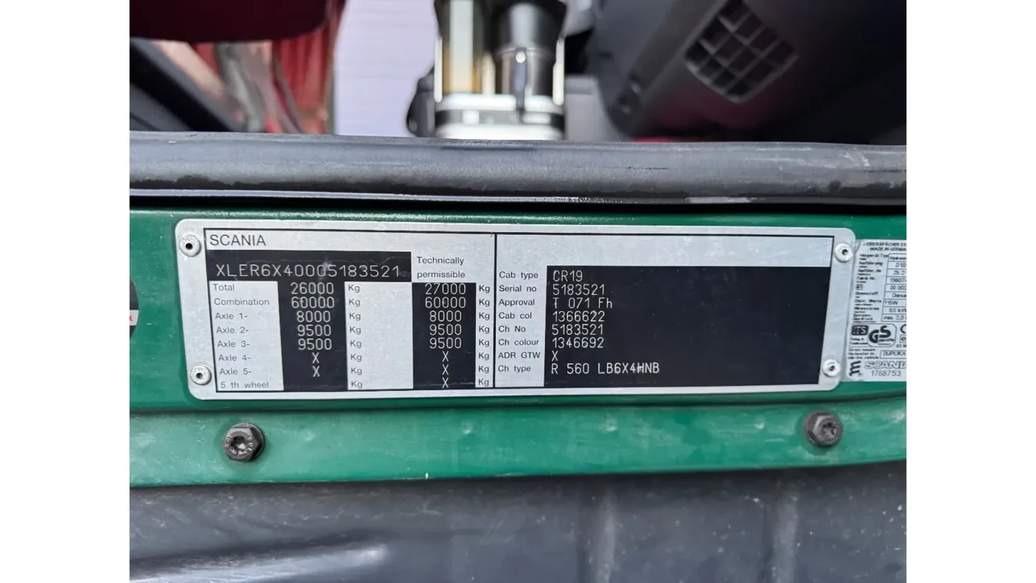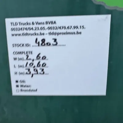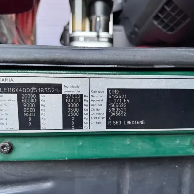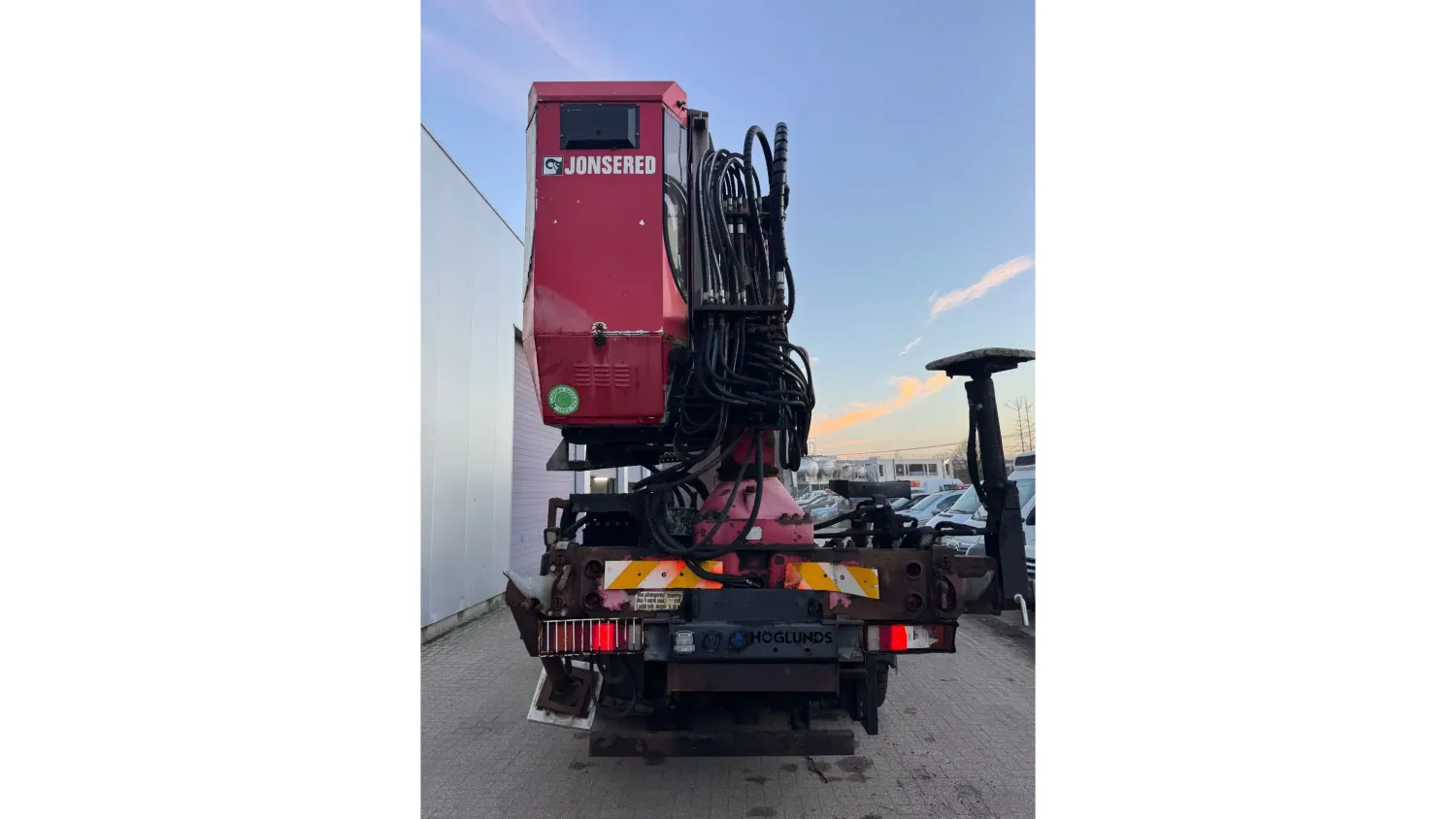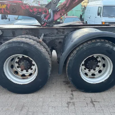 General information Year of construction: 2007 Reference number: 4803 Technical information Number of cylinders: 8 Empty weight: 14.765 kg GVW: 26.000 kg Axle configuration Front axle: Steering; Suspension: leaf suspension Rear axle 1: Double wheels; Suspension: air suspension Rear axle 2: Double wheels; Suspension: air suspension Functional Crane: JONSERED 1020, on rear of chassis Condition General condition: very good Technical condition: very good Visual appearance: very good Additional information Please contact Thierry Leemans (+32474042305, tld@proximus.be) for more information