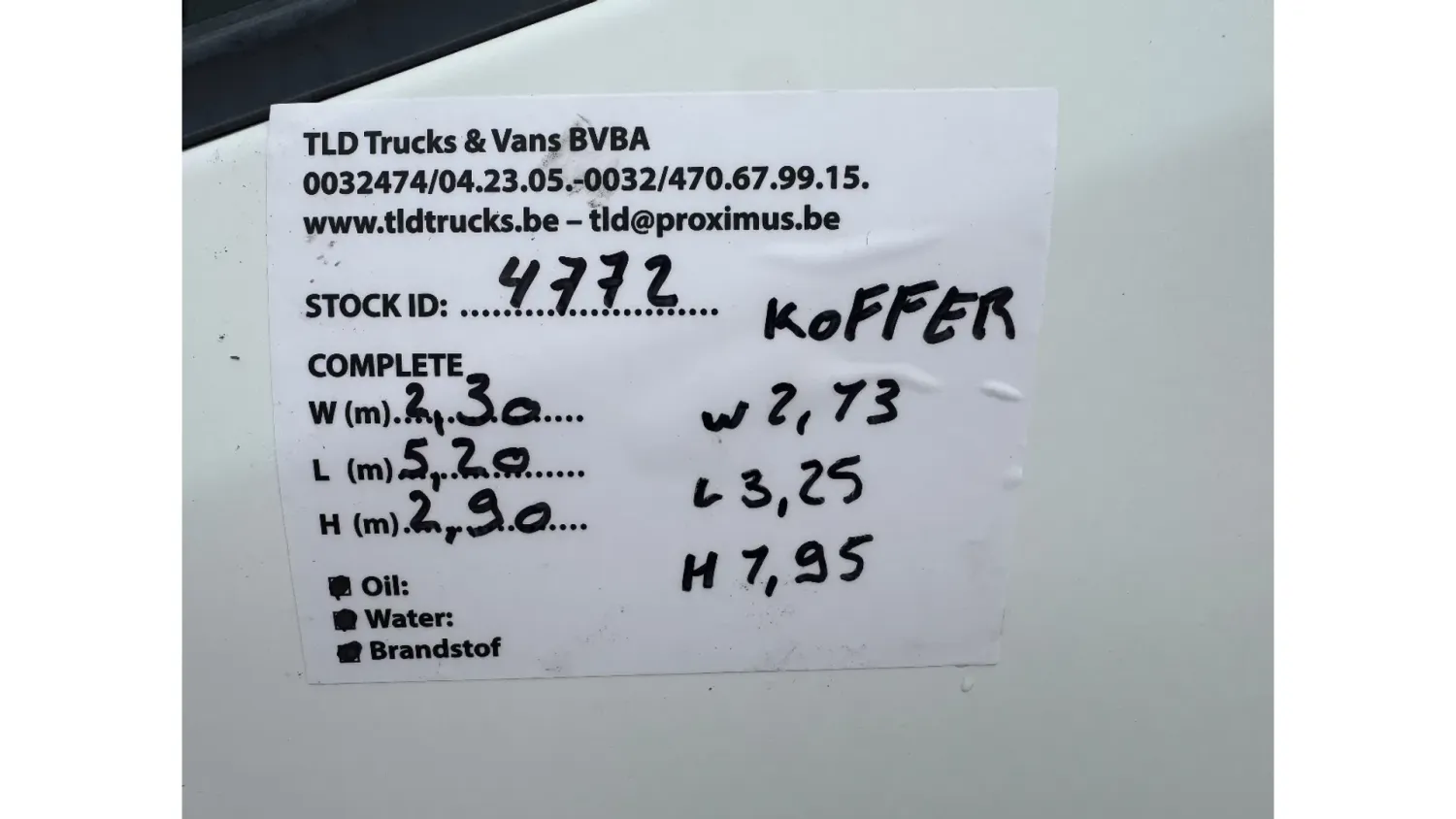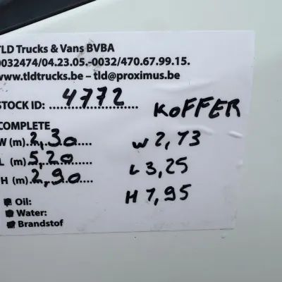 General information Type of body: Closed box Year of construction: 2009 Cab: day Reference number: 4772 Technical information Type of fuel: Diesel Front axle: Steering Rear axle: Double wheels; Suspension: leaf suspension Empty weight: 1.805 kg GVW: 3.500 kg Functional Dimensions of cargo space: 325 x 213 x 195 cm Tail lift: D'Hollandia, tail lift, 500 kg Condition General condition: very good Technical condition: very good Visual appearance: very good Financial information VAT/margin: VAT qualifying Additional information Please contact Thierry Leemans (+32474042305, tld@proximus.be) for more information BELGIAN ORIGINE