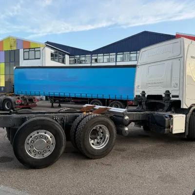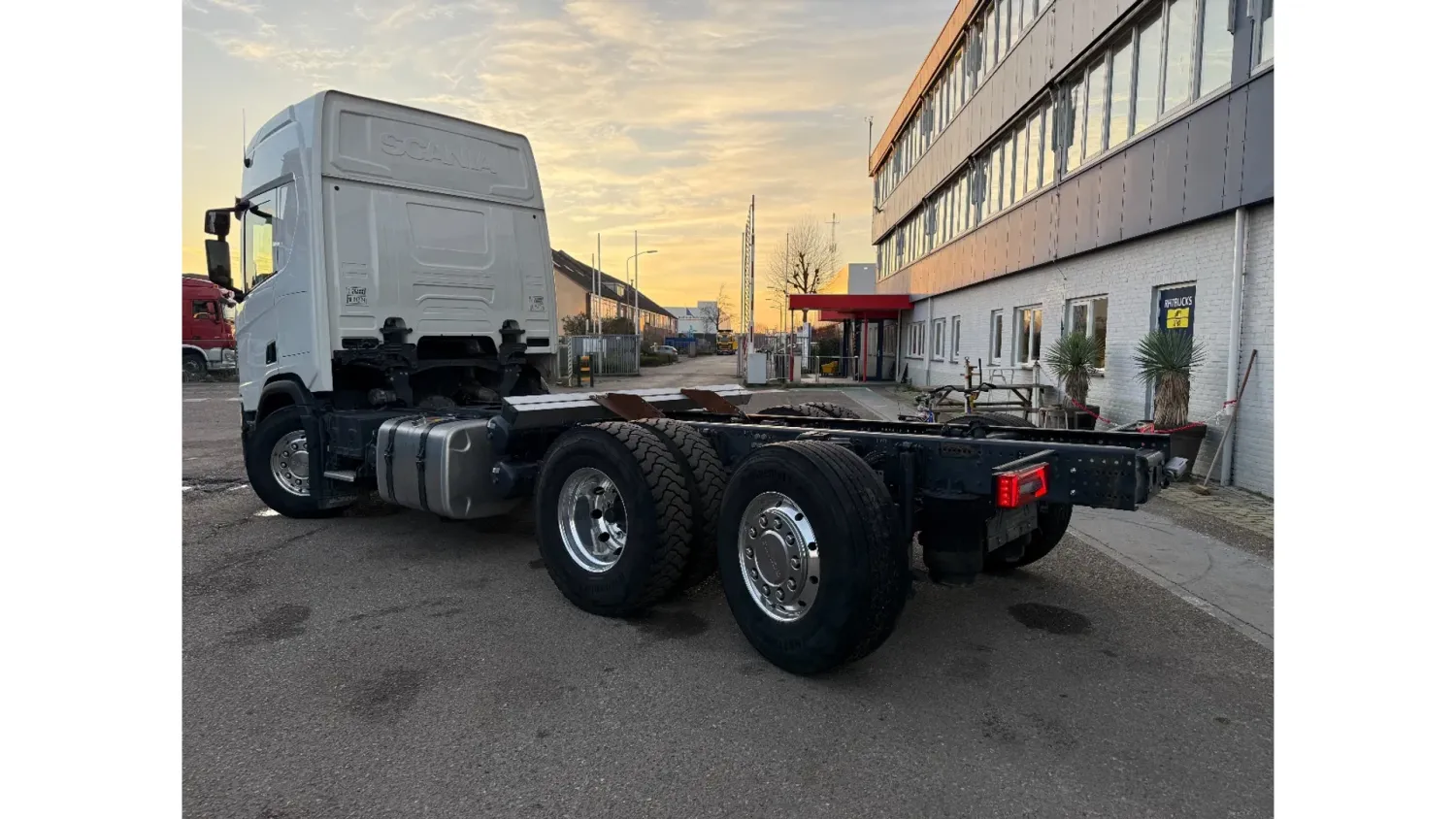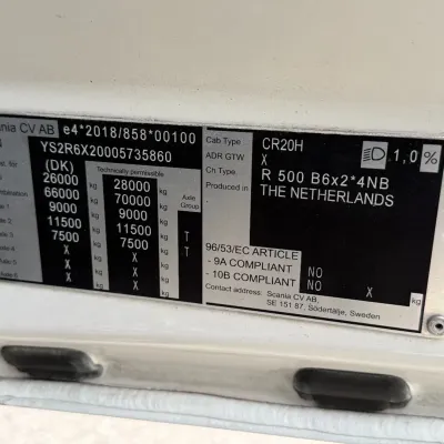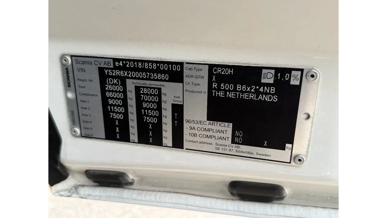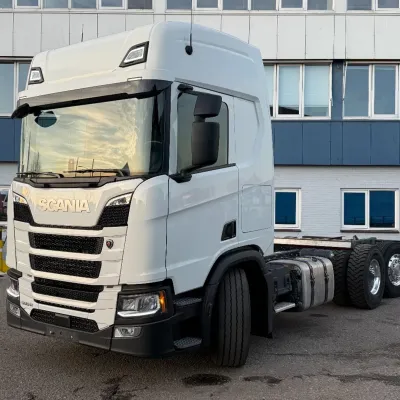 General information Year of construction: 2024 Reference number: RHT / SC735860 Technical information Number of cylinders: 6 GVW: 26.000 kg Drivetrain AdBlue system: Yes Axle configuration Make axles: ALCOA Front axle: Tyre size: 385/65R22.5; Max. axle load: 9000 kg; Steering; Tyre profile left: 70%; Tyre profile right: 70% Rear axle 1: Tyre size: 315/80R22.5; Double wheels; Differential lock; Max. axle load: 11500 kg; Tyre profile left inner: 90%; Tyre profile left outer: 90%; Tyre profile right outer: 90%; Tyre profile right outer: 90%; Reduction: single reduction Rear axle 2: Tyre size: 385/65R22.5; Lift axle; Max. axle load: 7500 kg; Steering; Tyre profile left: 40%; Tyre profile right: 40% Additional information Please contact Frank de Jong (+31623157042, fj@rhtrucks.nl), Rene Jerphanion (+31612511348, rj@rhtrucks.nl) or Sven Rommens (+31614226034, sr@rhtrucks.nl) for more information